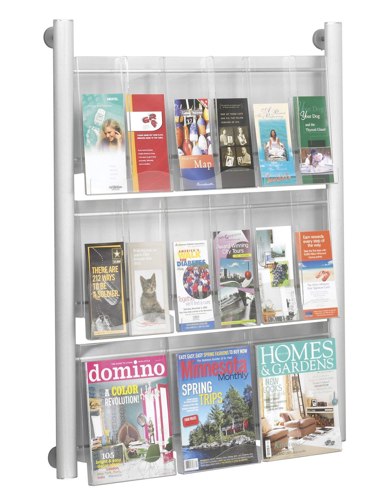A sleek and elegant way to display your literature. The silver coated, brushed aluminum frame and clear acrylic pockets add a stylish blend to any decor. Center pocket dividers allow for the pockets to be sized for magazines or pamphlets. Available as either a floor display or wall mounted units.