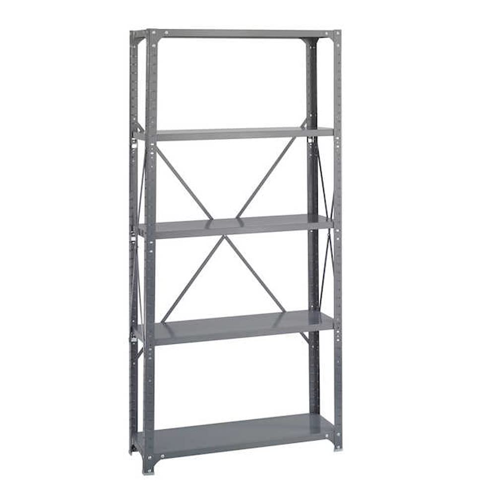 Product DescriptionCommercial Shelving Unit 36"W x 12"D x 75"H with box beam shelf design and double-sided compression clips support loads up to 750 lbs. per shelf, evenly loaded. Unit includes 4 posts and cross braces. Shelves can be easily repositioned in one-inch increments. Shelves feature corner brackets which help prevent rocking and improve overall stability and rigidity. A hat channel under every shelf increases overall strength. Steel construction with durable powder coat finish.From the ManufacturerBox beam shelf design and double-sided compression clips.