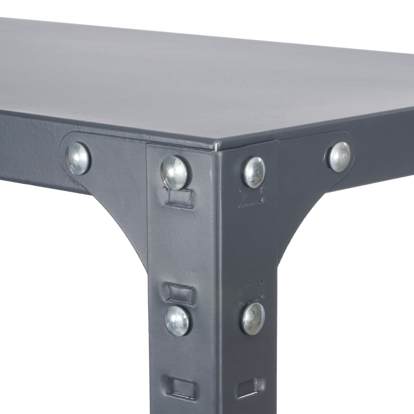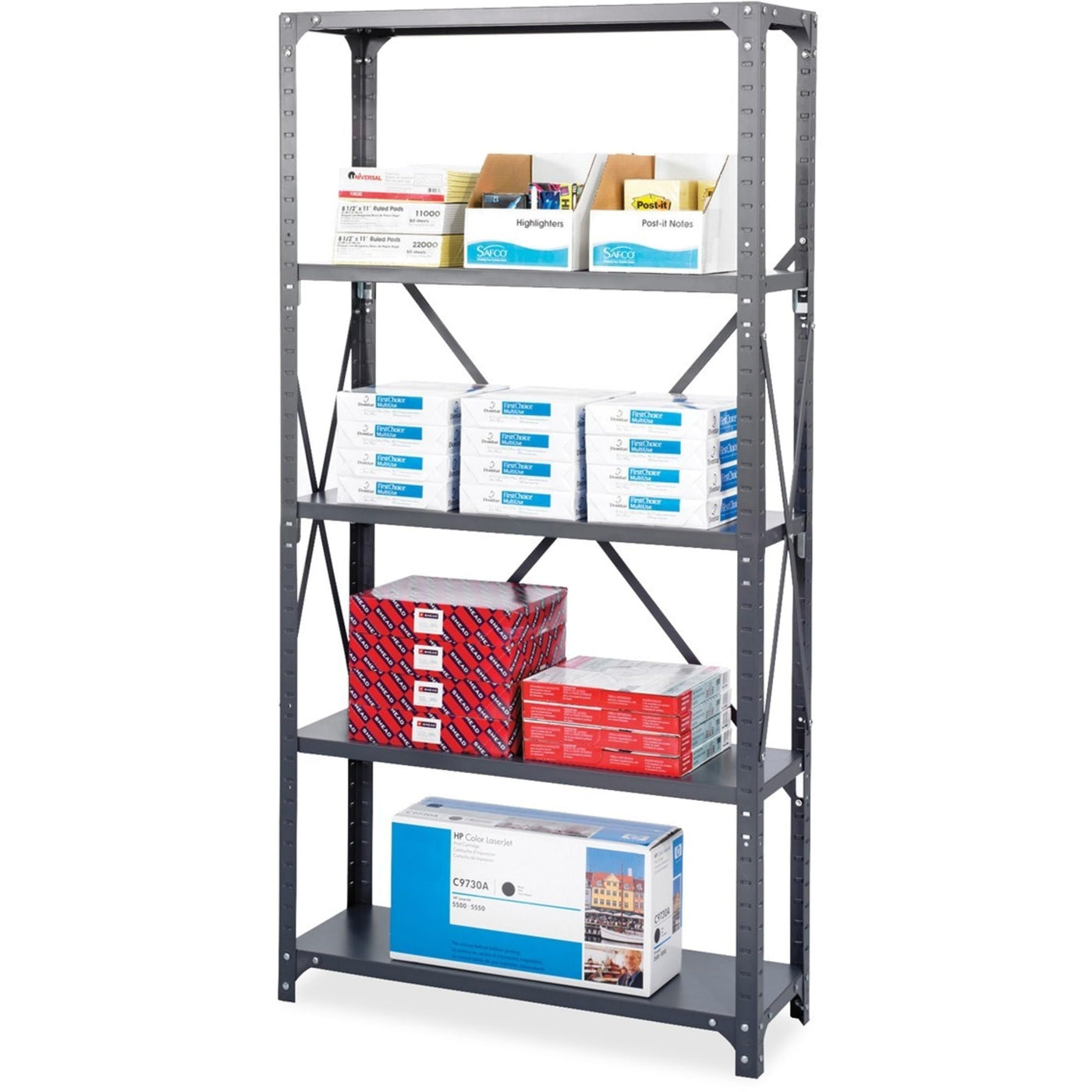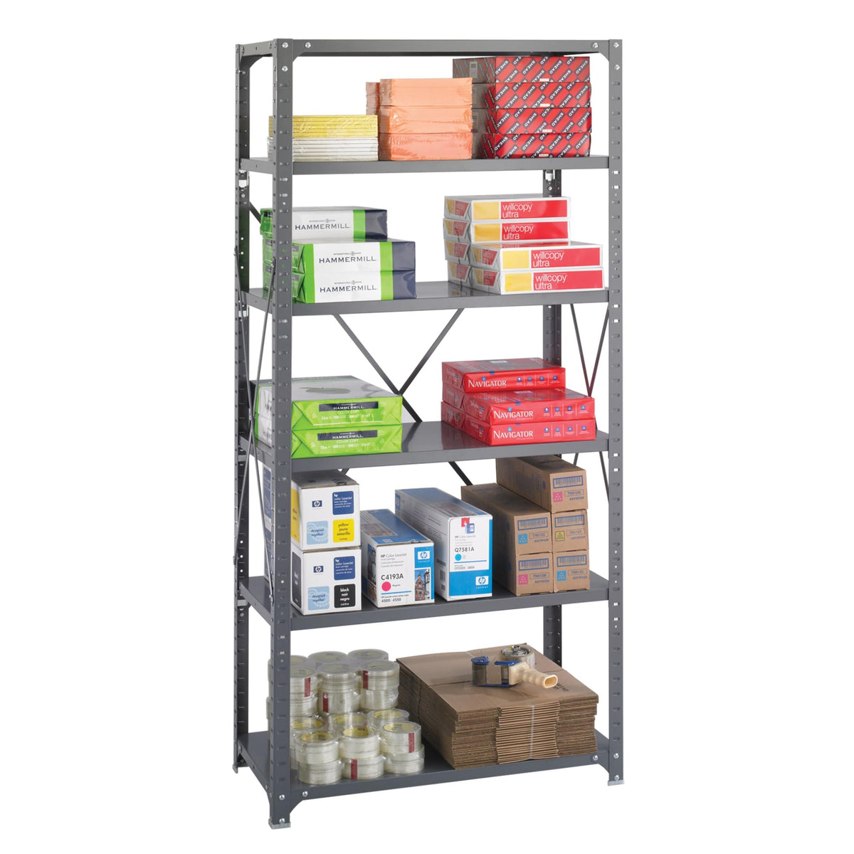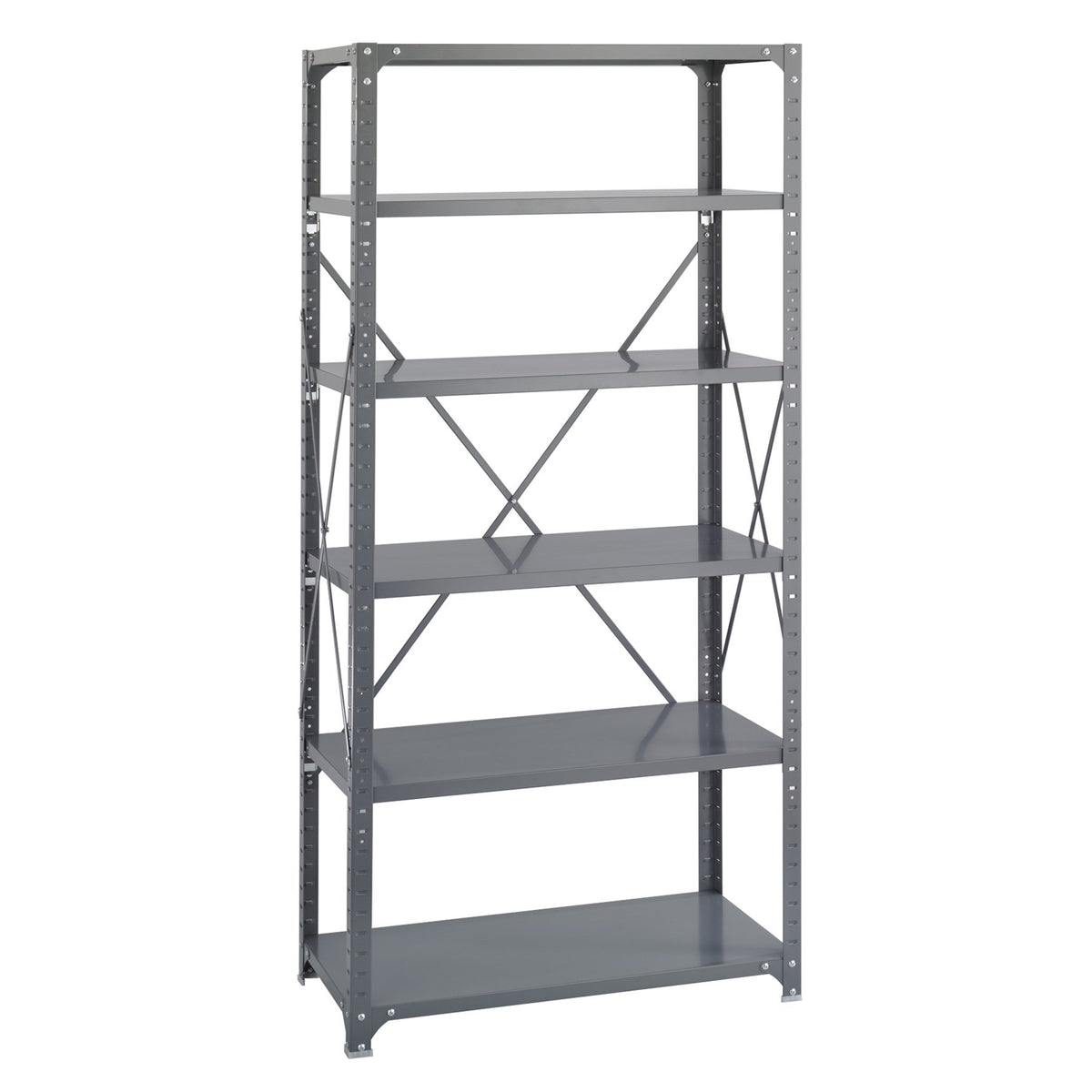 Commercial Shelving Unit 36"W x 18"D x 75"H with box beam shelf design and double-sided compression clips support loads up to 650 lbs. per shelf, evenly loaded. Unit includes 4 posts and cross braces. Shelves can be easily repositioned in one-inch increments. Shelves feature corner brackets which help prevent rocking and improve overall stability and rigidity. A hat channel under every shelf increases overall strength. Steel construction with durable powder coat finish.