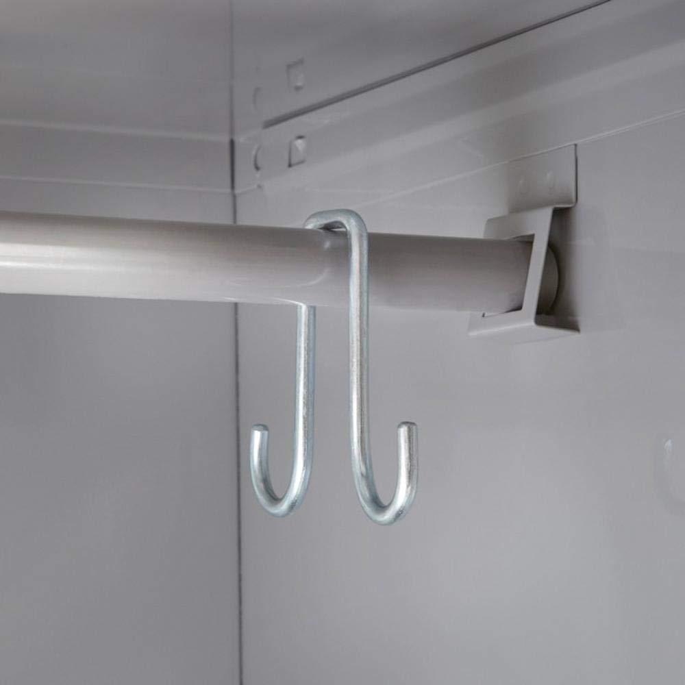 Lock it up with style. The contemporary two tone lockers will fit into any environment. Double compartment locker 12"W x 18"D x 78"H with strong, one piece uni-body design boasts a heavy gauge all steel construction so it can stand up to tough conditions in any environment where extra, secure storage is needed. Unit can be used as stand alone or can be linked together with additional units. Recessed handle with padlock provision for maximum security (padlock not included) has no protruding parts and includes a 2 point locking mechanism for complete security. Double compartment has a hat shelf with coat hooks as well as adjustable hooks for coat rods. Two-tone, powder coat finish for durability. Lockers come fully assembled. Complements design of Safco Products Steel Storage Cabinets Models 5530, 5531 and 5532 (sold separately).
