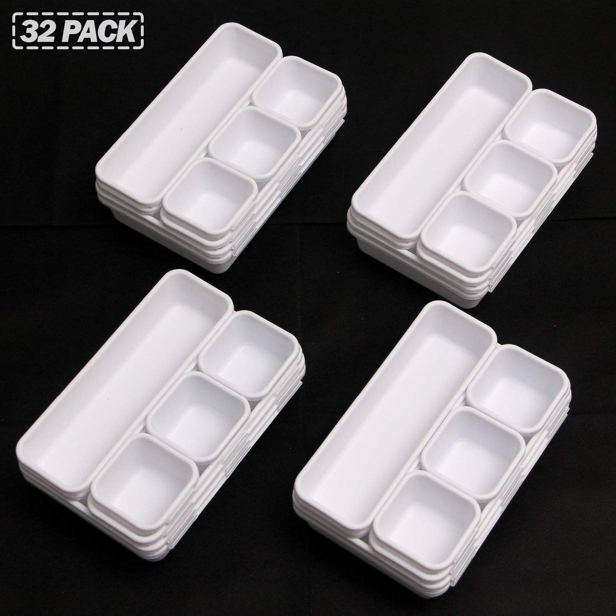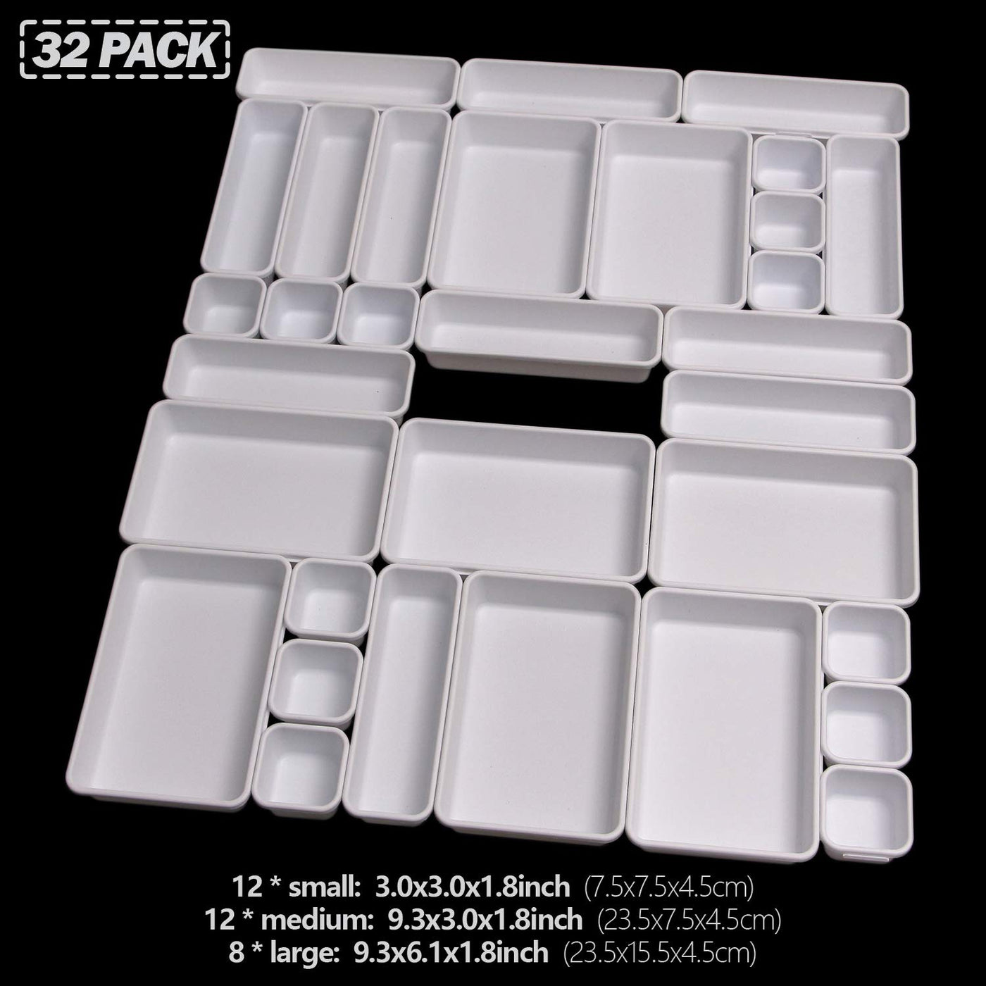 1.Drawer Organizer: These Shallow Desk Drawer Organizer Will Keep Your Accessories Neat, Tidy And Organized. Perfect Drawer Inserts For Makeup Drawer Organizer, Bathroom Drawer Organizer, Office Drawer Organizer, Bathroom Drawer Dividers Being Ideal For Bathroom, Office Products, Cosmetics Or Vanity To Organize Hair Accessories. Set Of 32 Includes 8 Large Bin Trays Each 9.3 X 6.1 X 1.8 Inches, 12 Medium Bins 9.3 X 3.0 X 1.8 Inches, 12 Small Bins Of 3.0 X 3.0 X 1.8 Inches. 2.Customize Layout: Different Size Drawer Organizers Which You Can Customize The Layout To Fit Any Size Drawer Or Specific Need. Separate Pieces Can Be Split Up For Different Uses And Drawers. Perfect For Dresser / Bathroom / Kitchen / Office Drawers, Organizing Cosmetic, Make Up Tools, Hair Accessories, Nail Polish, Hairbrushes, Silverware, Office Supplies Etc. 3.Durable & Easy To Care: Made From Durable Plastic, These Shallow Drawer Dividers Organizers Can Be Used Together Or Separately, And Rearranged To Suit The Exact Dimensions Of Your Drawer. The Vanity Drawer Organizer Helps You Maximize Unused Spaces Throughout The Home Areas Including; Closets, Laundry, Office And Other Living Spaces. Only Requires A Cloth For Fast And Effortless Cleaning. Makes Everything Look Beautiful And Better Organized. It Will Match Almost Any Decor. 4.The Everything Interlocking Drawer Organizer: No Matter Where You Use This Set Of 32 Durable Desk Drawer Organizers And Storage - In The Kitchen, Bathroom, Vanity Makeup, Or Office - This Multipurpose Desk Drawer Organizer Tray Shallow Keeps Your Things In Order. You Can Freely Mix And Match Them To Increase The Storage Capacity In Your Drawers To Fit A Variety Of Home And Office Needs. 5.Handy & Versatile: Not Just For The Kitchen - Organize Office, Bathroom, Vanity And Make Up Drawers Too. Our Small Organizer Bins Are Designed For The Bathroom, Kitchen, Make Up Closet, Laundry.