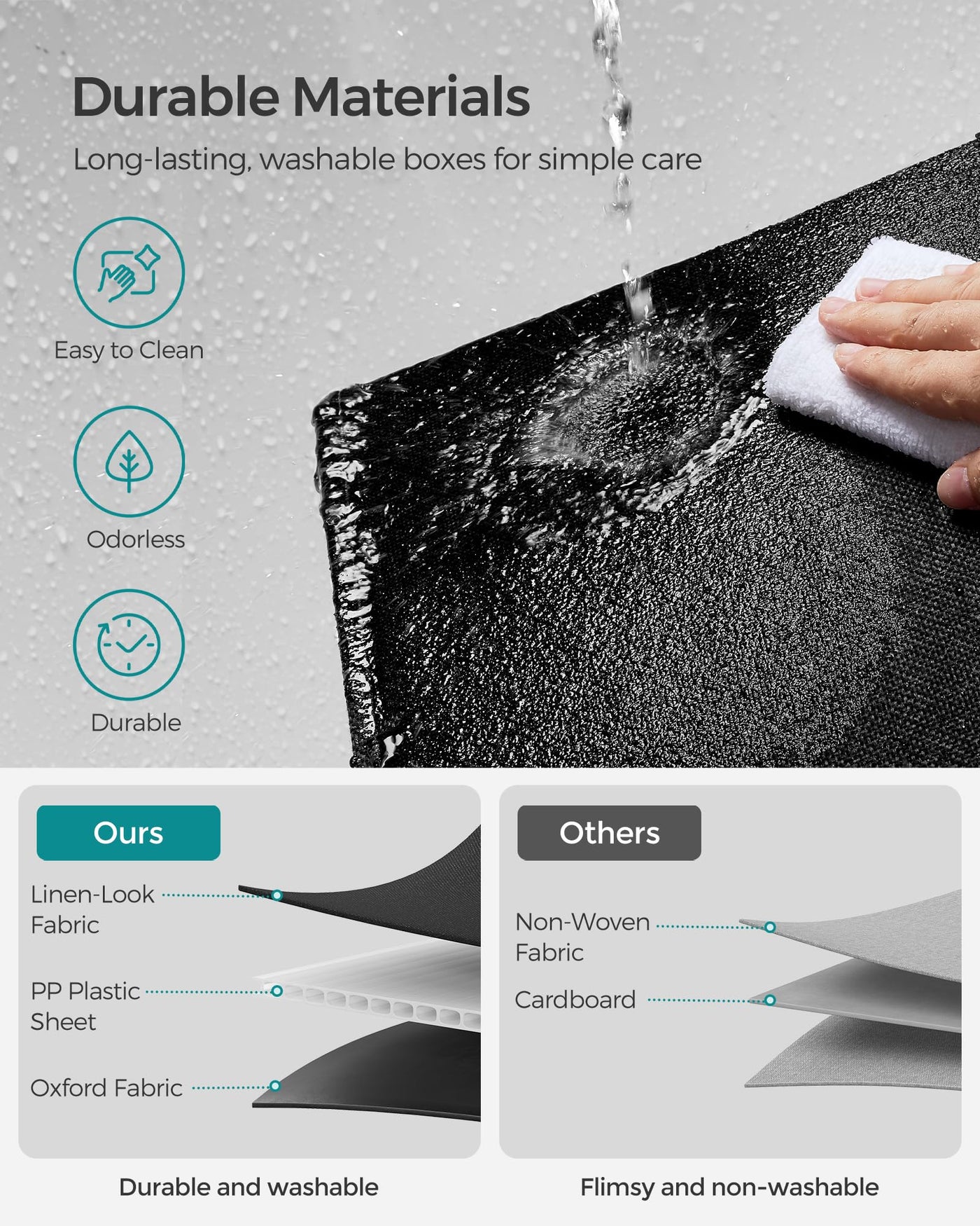 Specifications: - Color: Ink Black - Material: Linen-Look Fabric, Oxford Fabric, Pp (Polypropylene) Plastic - Size Of Each Box: 11.8''L X 11.8''W X 11.8''H (30 X 30 X 30 Cm) - Total Weight: 3.7 Lb (1.7 Kg) - Volume Of Each Box: 7.1 Gal. (27L) - Max. Static Load Capacity Of Each Box: 11 Lb (5 Kg) Package Contents: - 4 X Storage Cube Songmics Notes: - Do Not Machine Wash. - Insert The Bottom Panel First Before Use. - For Dry Stains, Remove By Wiping With A Damp Cloth. - For Wet Stains, Blot With A Kitchen Roll, Then Clean With A Dampened Cloth With A Neutral Solution. Don'T Rub Back And Forth. - Avoid Hard Scrubbing During Cleaning To Prevent Damage. After Washing, Just Unfold And Air Dry. - Follow The Washing Instructions On The Care Label For Cleaning.