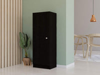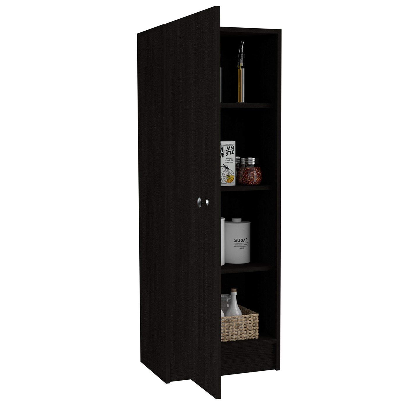The Uluru storage cupboard brings a modern style to any room . This four shelf cabinet hides away clutter behind a single door. Perfect for use in the kitchen, bedroom, living room, dorm room, office or any other room that would need a compact storage unit. This piece is a great compliment to the Helis Kitchen Pantry. Product Dimensions are 47.4 H x 12,3 W x 16.9 L.Features Color: Black Product Size: 16.9"W x 47.4"H x 12.3"D Texture: Woody Eviroment: Kitchen Room Doors: 1 Shelves: 3 Made In China