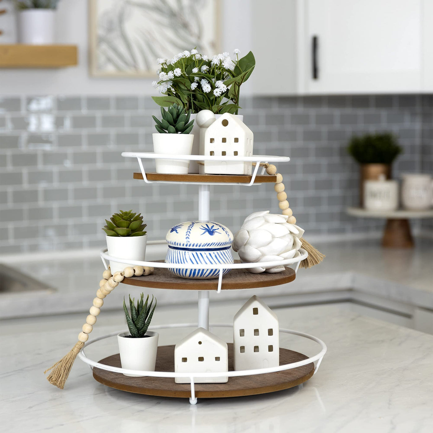 This Three Tiered Metal and Wood Decorative Stand is the perfect way to creatively and fashionably help control clutter. Made from a mixture of wood and metal, this stand is designed for years of use. There are three wooden bases that sit inside metal holders. The matte white metal combined with the cedar stained grainy wood gives this stand a modern yet traditional look. The three tiers are separated by one white metal column that runs through and ends with a metal bauble on top. You can use this serving stand to store and display your favorite plants, photos, and decorative accessories. Great for a charming rustic ambiance, this tray adds a relaxed casual and organized feel to your space. 16.25' H x 15' W x 15' D