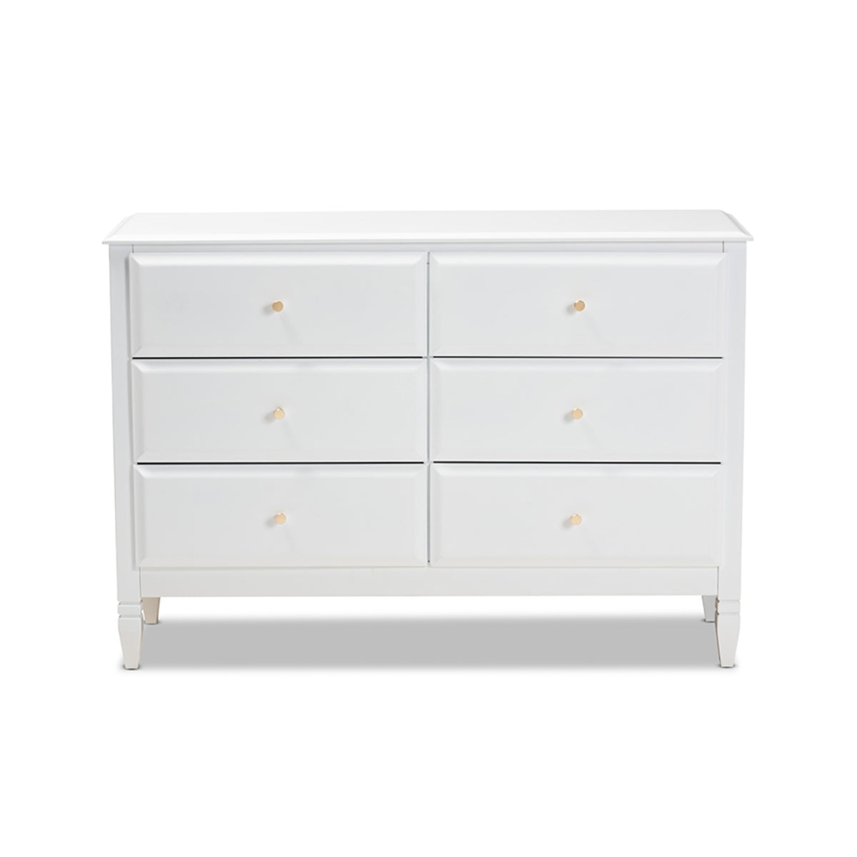 A classic silhouette receives a glamorous update in the Naomi dresser. Made in Malaysia, this wooden dresser displays a polished white finish that brightens any space. The tabletop is well suited for a lamp and trinkets, while six drawers provide ample storage space for clothing and linens. Each drawer is adorned with a striking gold-tone knob that adds a touch of glamour. Inspired by traditional design, the Naomi features tapered feet with recessed detailing. Requiring assembly, the Naomi dresser strikes the optimal balance between classic and contemporary for a look that enhances any bedroom.