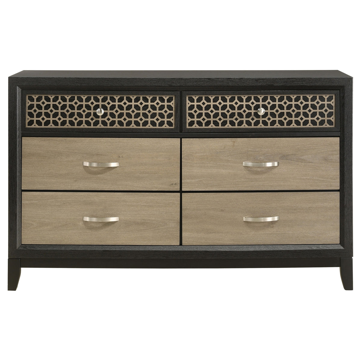 Take style to a new height in your modern or transitional bedroom space. This artisan-inspired six-drawer dresser creates an exceptional look with tasteful and attractive detail. Wood and wood products construction offers a sturdy feel in a dresser with a versatile finish duo of black and light brown. Decadent cutout trim on its upper drawers embellishes an already chic look with a tempting geometric pattern. Metal drawer hardware accompanies English dovetail construction and easy opening on Kenlin glides.