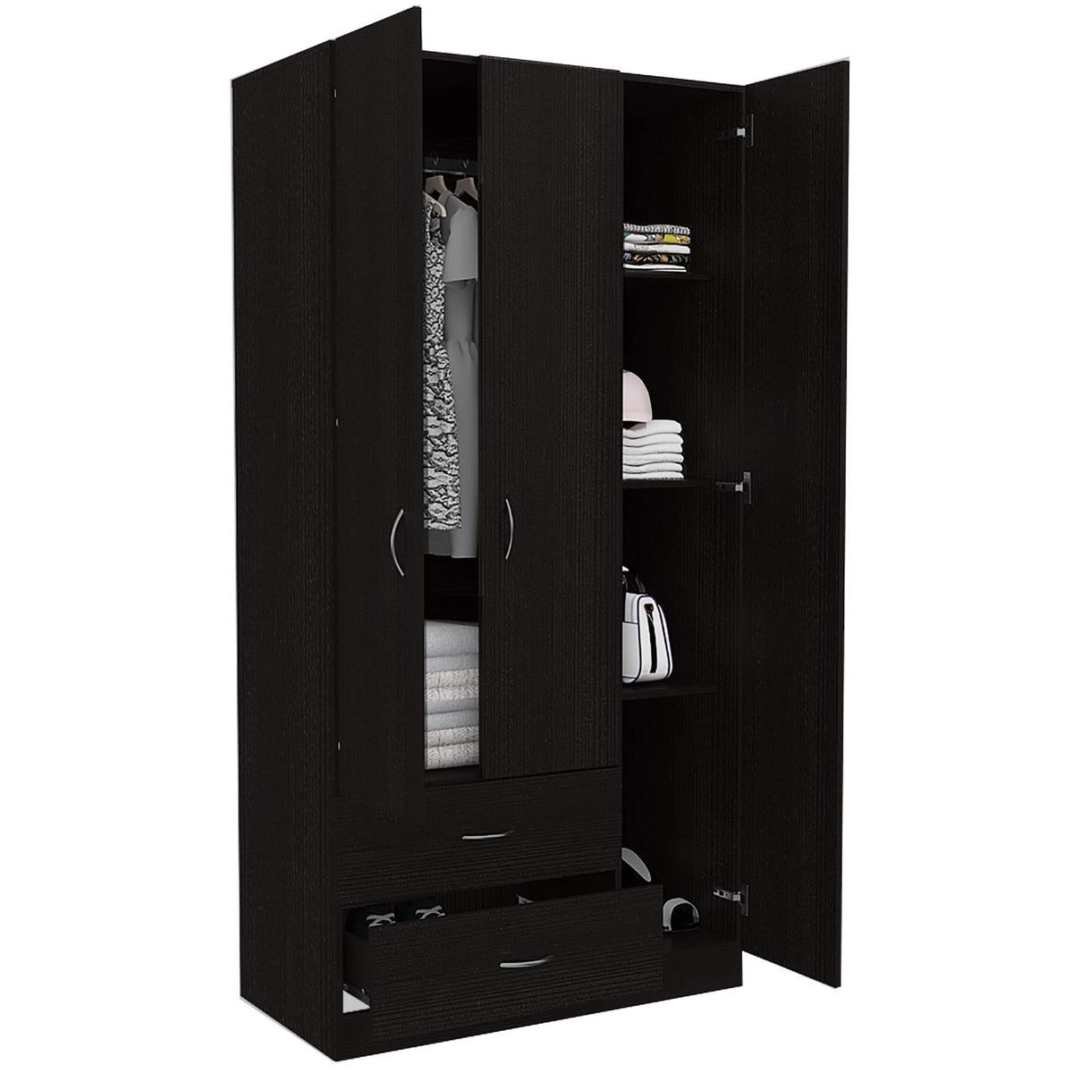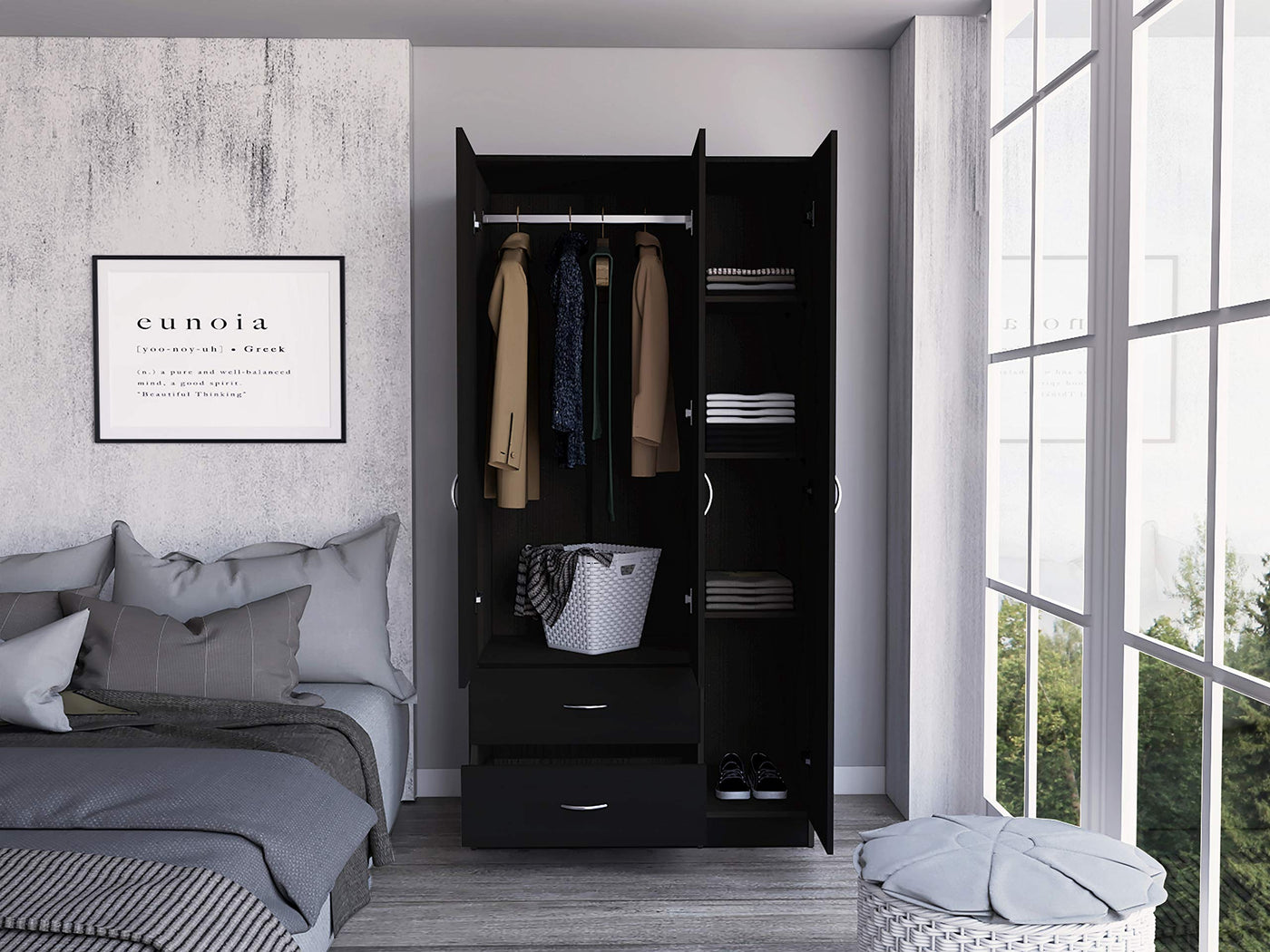 The Bosko 3-Door Armoire offers a perfect storage solution for your bedroom, featuring five tall spacious shelves for clothing and accessories, two drawers, and a metal hanging rod. Its elegant black finish adds a touch of sophistication to any room. This armoire provides ample space to keep your wardrobe organized and easily accessible. Designed with high-quality materials, it combines functionality and style, making it a great addition to any bedroom. Dimensions: Height: 70.8" Width: 35.4" Depth: 18.5" Furniture Type: Ready to assemble (full assembly required). Certifications: CARB phase II compliant – TSCA Title VI Compliant. Warranty: 1-year warranty coverage on wooden parts and hardware from the manufacturing date found on the product box.