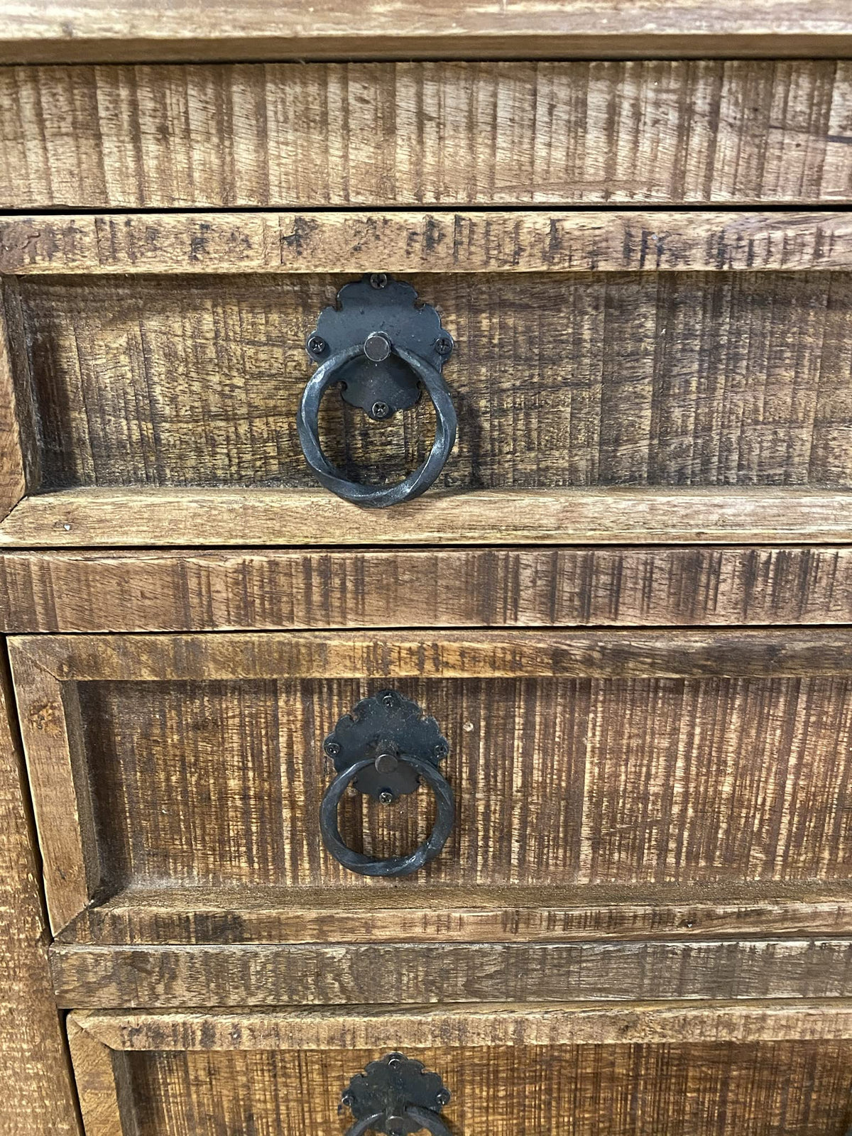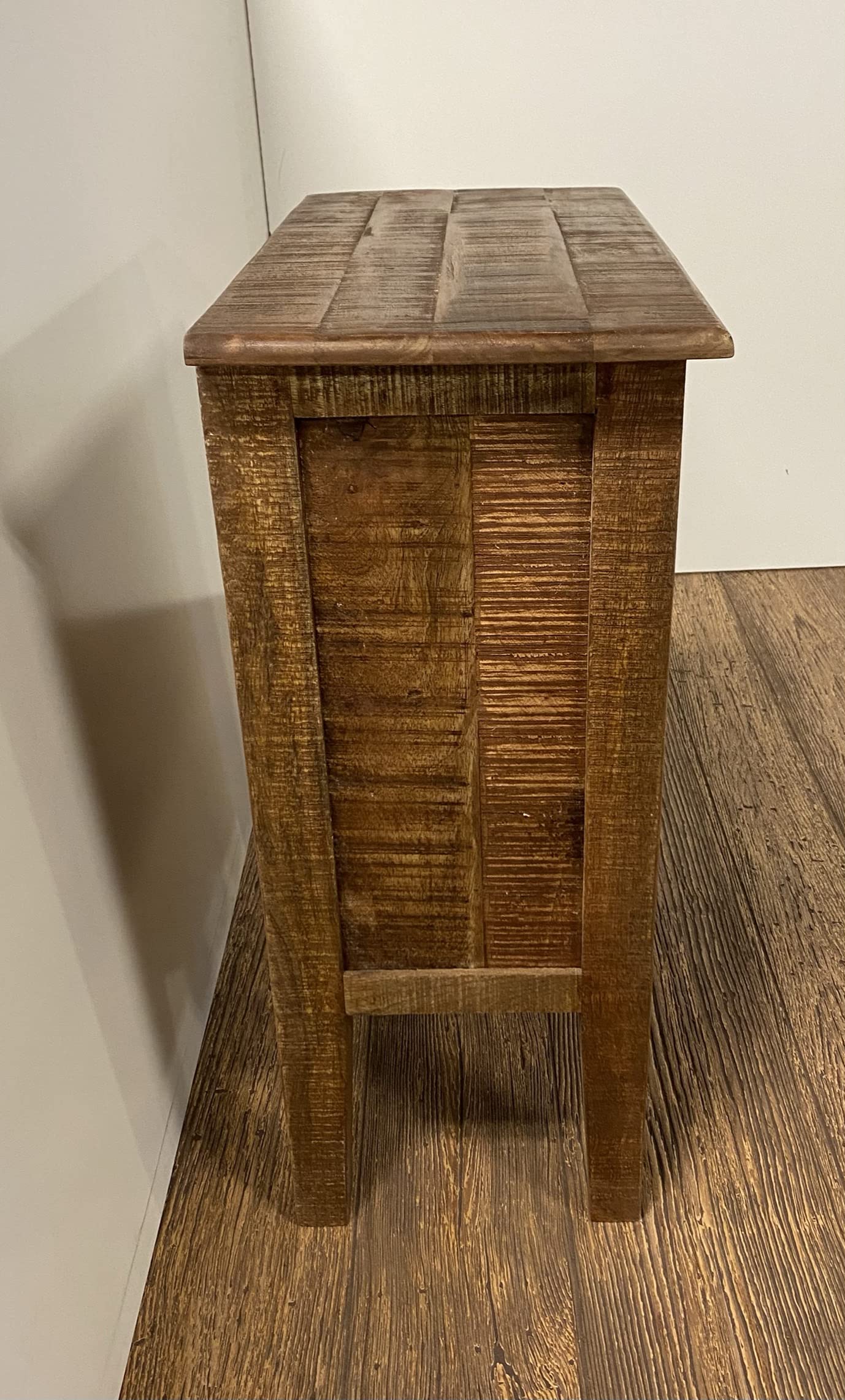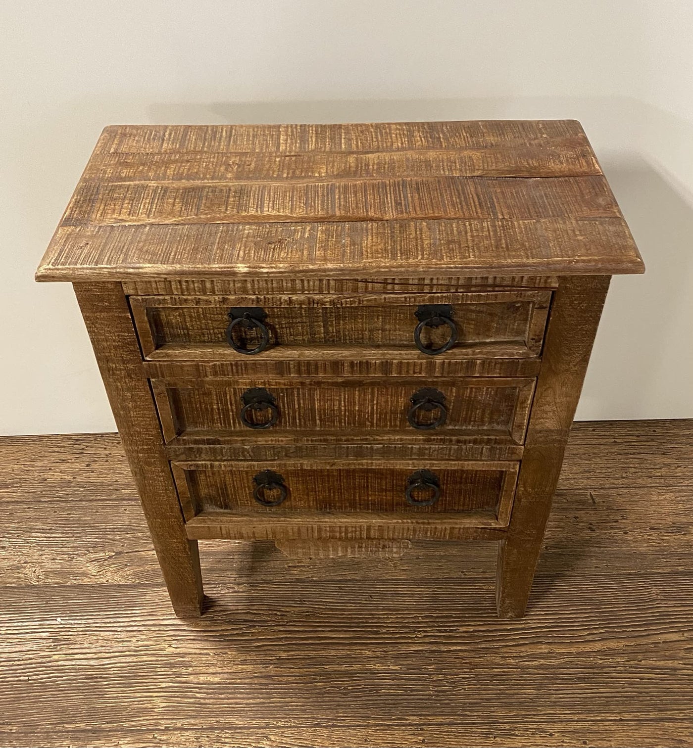 This Vintage Style Rustic Farmhouse Three Drawer Dresser will blend with most any room decor. The warm honey brown rustic look of this solid mango chest shows lots of grains and natural wood features. The three drawers provide good storage and the vintage look black drawer pulls give this dresser extra charm. Can be used a dresser in the bedroom but just as easily as a chest for linens or tableware in the hallway, dining room, or living room. 31.5'' H x 13'' W x 26'' D