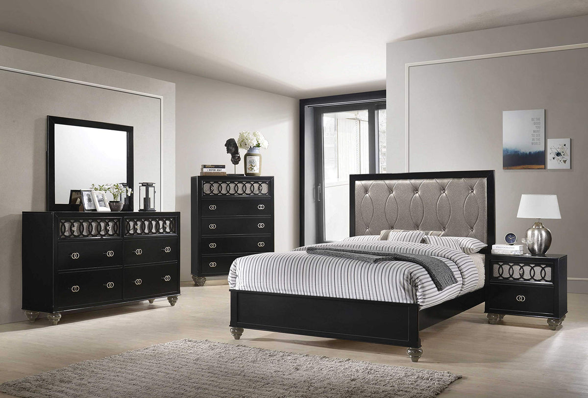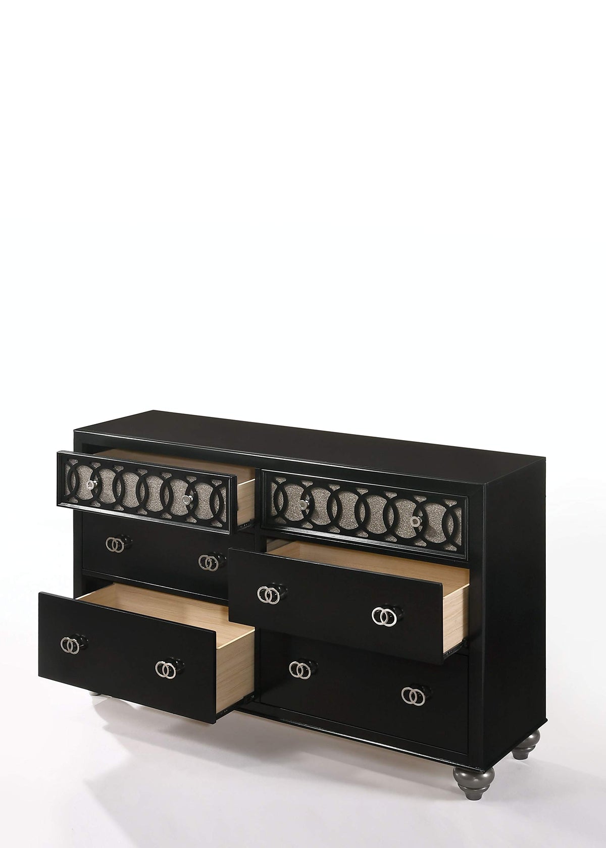 With Contemporary Flair, The Dresser Immediately Draws Your Eyes To Its Captivating Design. This Contemporary Dresser Features An Elegant Copper And Raised Geometric Top Drawer Inlay, Combined With A Rich Black Finish. The Elegant Six-Drawer Dresser Is Accented With , Overlapping Ring Drawer Handles And Copper Accented Wood Bun Legs. The Versatile Style Of This Dresser Allows It To Be A Complimentary Piece To Any Bedroom Decor.**