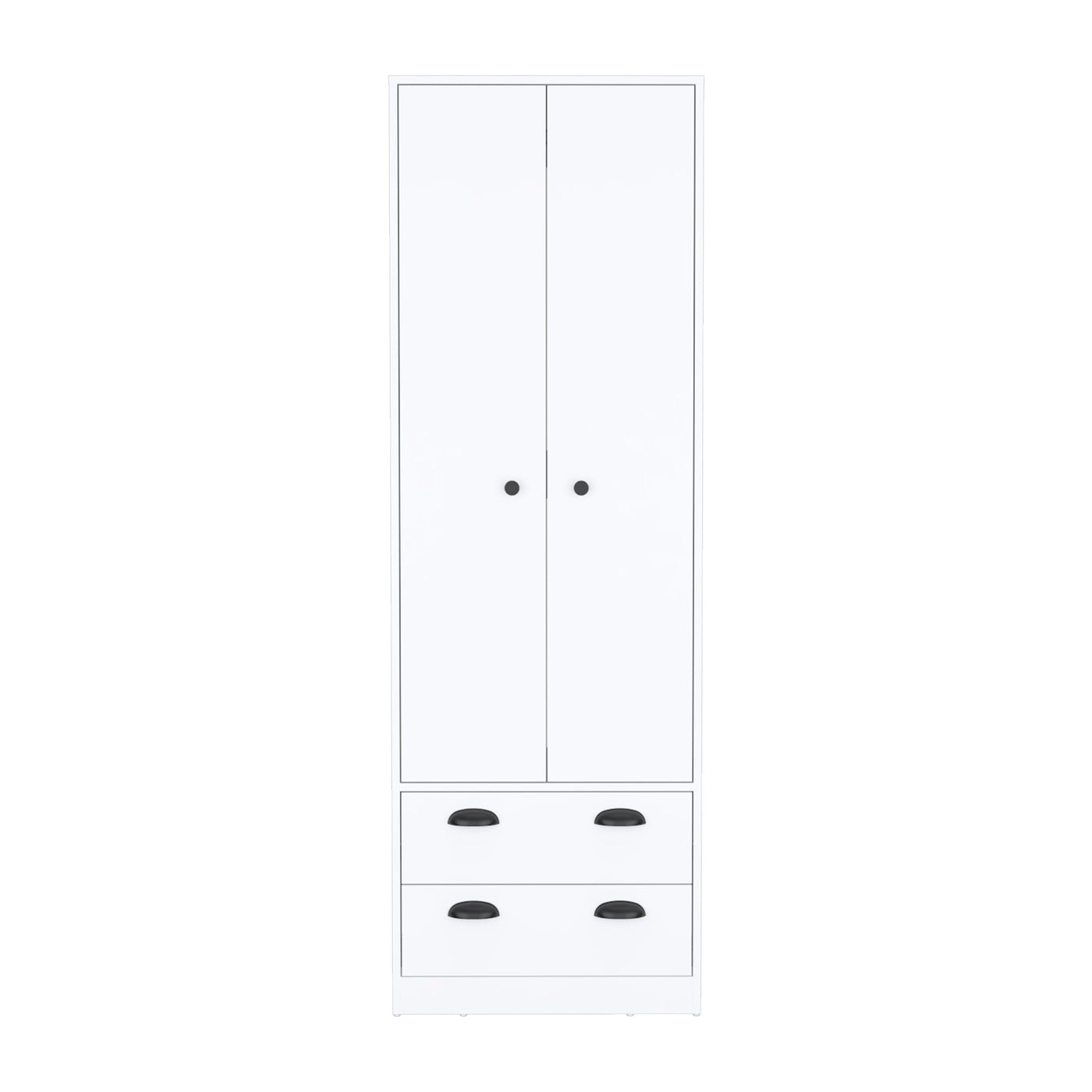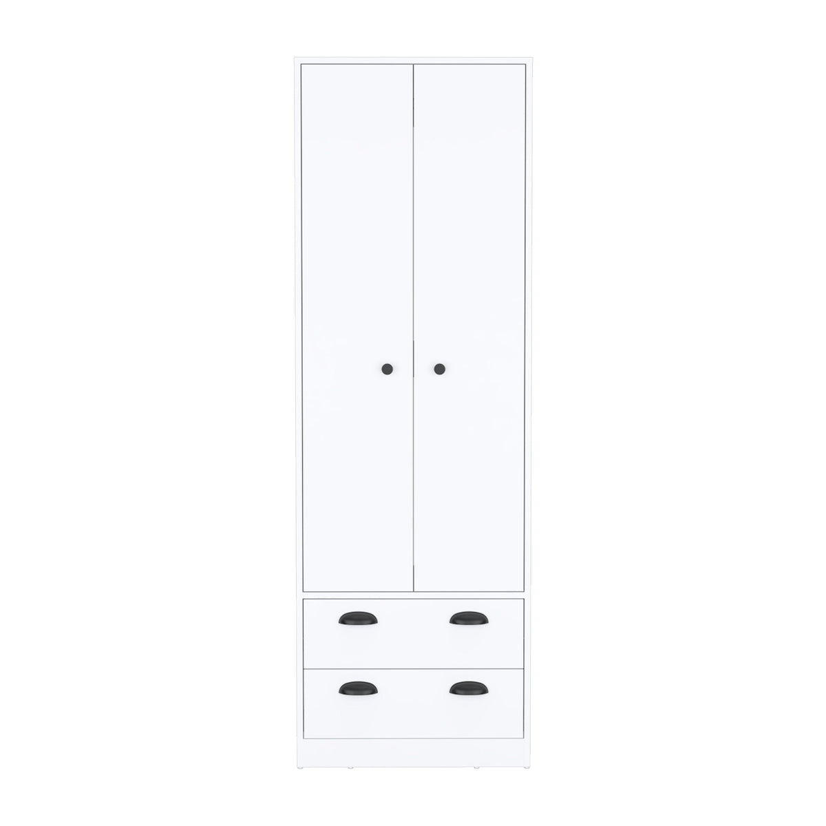 Upgrade your living space with the exquisite Bonaire Armoire, a stunning addition that seamlessly merges fashion and function. Crafted from elegant manufactured wood and available in classic white and bold black finishes, this armoire is designed to make a statement in any room. The Bonaire Armoire features 2-door cabinets that open to reveal spacious inner storage, complete with a sturdy hanging rod for all your clothing needs. Whether it's your favorite outfits or seasonal attire, this armoire ensures your garments stay organized and easily accessible. Below the cabinet, two generously-sized drawers (20"W x 15.7"D) with stylish handles provide ample space for your belongings. These drawers offer a practical and attractive storage solution, perfect for storing accessories, linens, or additional clothing. The Bonaire Armoire's design is characterized by its refined lines and attention to detail, making it a standout piece that effortlessly complements any interior. With its versatile finishes and timeless design, the Bonaire Armoire adapts to any style and adds a touch of elegance to your home. Don't miss the chance to transform your space with the Bonaire Armoire – a harmonious blend of form and function that will elevate your living experience! Dimensions: Height: 70,5" Width: 23,31" Depth: 19,7" Furniture Type: Ready to assemble (full assembly required). Certifications: CARB phase II compliant – TSCA Title VI Compliant. Warranty: 1-year warranty coverage in wooden parts- 1-year warranty coverage in hardware pieces since its manufacturing date found in the lot number printed in the product box.