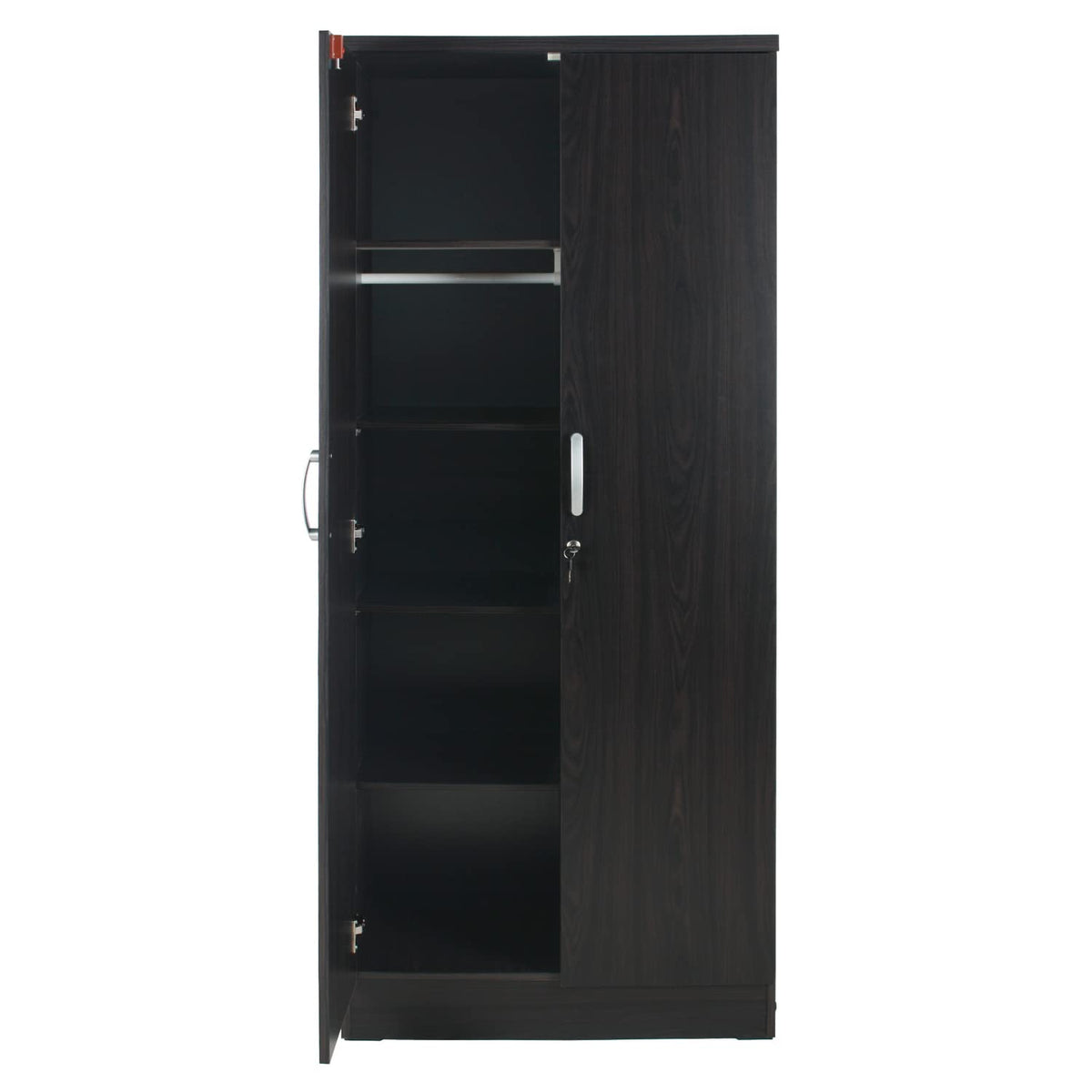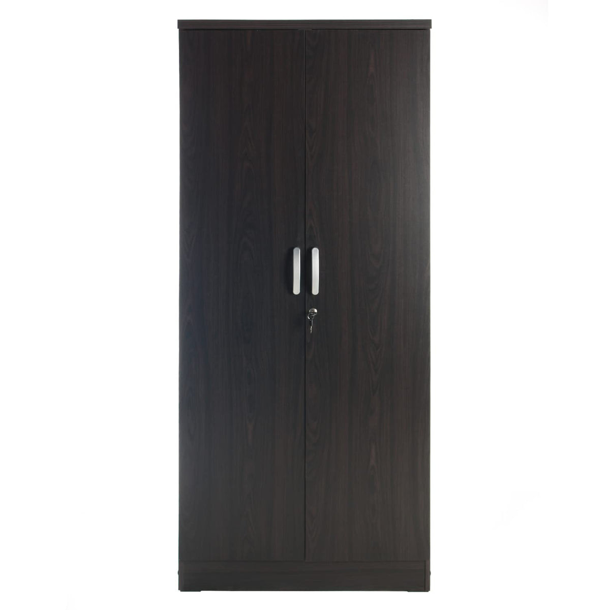 Keep your room, basement workshop, or storage shed organized and optimized with the Better Home Products Harmony Wood Two Door Armoire Wardrobe Cabinet. Crafted of sturdy laminated engineered wood, this cabinet strikes a tall, clean-lined rectangular silhouette. Two lockable doors with silver finish plastic bar pull smoothly open to revel one fixed top shelf and 3 removable shelves that can be used to store clothing, bed sheets, pillowcases, blankets, baskets of smaller equipment's and so much more. The heavy-duty crossbar garment rod allows you to neatly hang your clothes up if you prefer. Available in Beech (Maple), Black, White, Mahogany, Tobacco and Gray color finish options. Assembly required.
