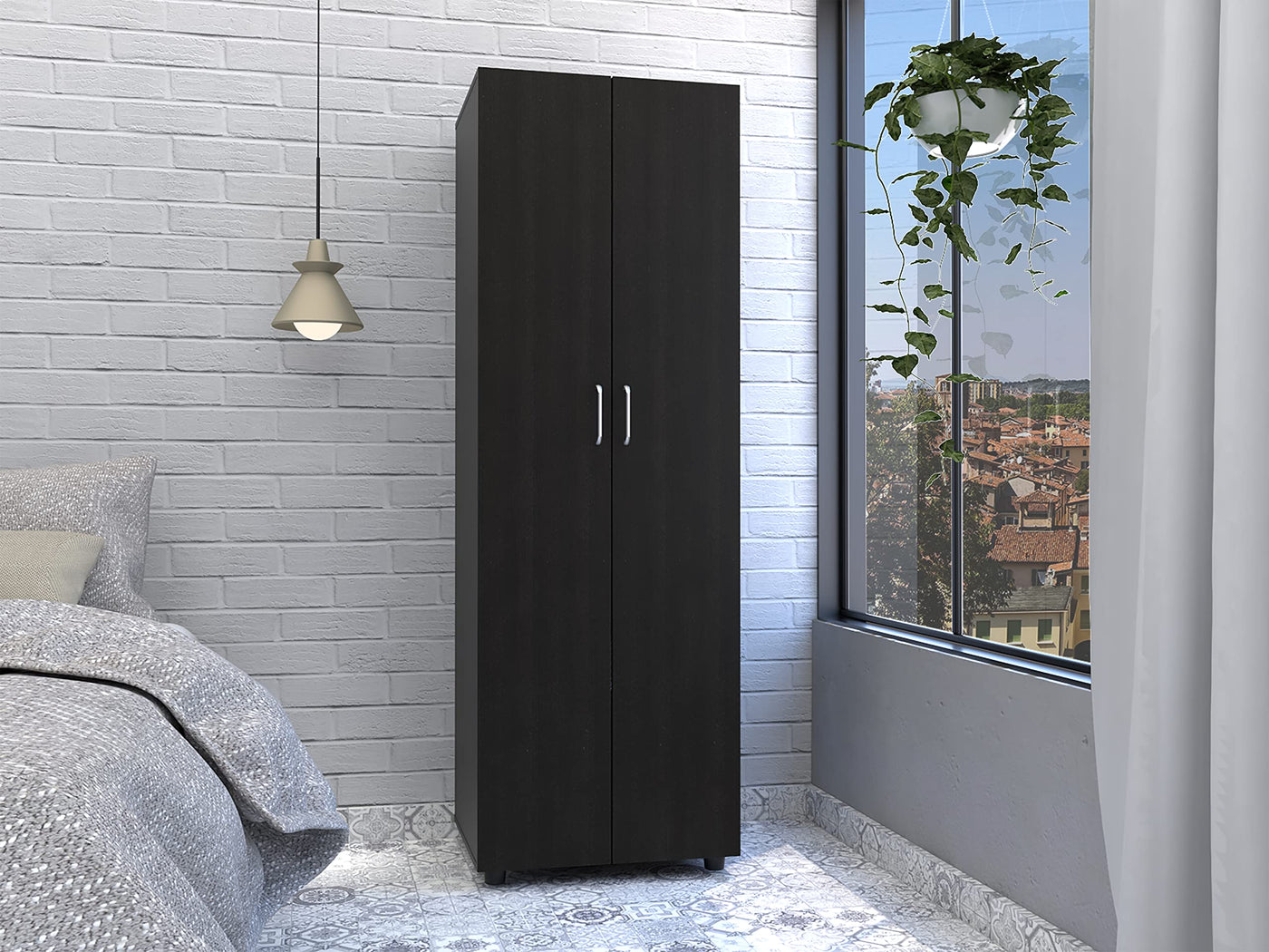 London Double Door Armoire, this armoire is not your ordinary storage piece. With its unique style and extra features, it's sure to make a statement in any room. The two interior shelves provide ample space for all of your belongings, and the metal rod is perfect for hanging clothes. Plus, the doors ensure that your items are always safe and sound. Designed with elegant black manufactured wood finish. Dimensions: Height: 70,8" Width: 23,6" Depth: 19,5" Furniture Type: Ready to assemble (full assembly required). Certifications: CARB phase II compliant – TSCA Title VI Compliant. Warranty: 1-year warranty coverage in wooden parts- 1-year warranty coverage in hardware pieces since its manufacturing date found in the lot number printed in the product box.