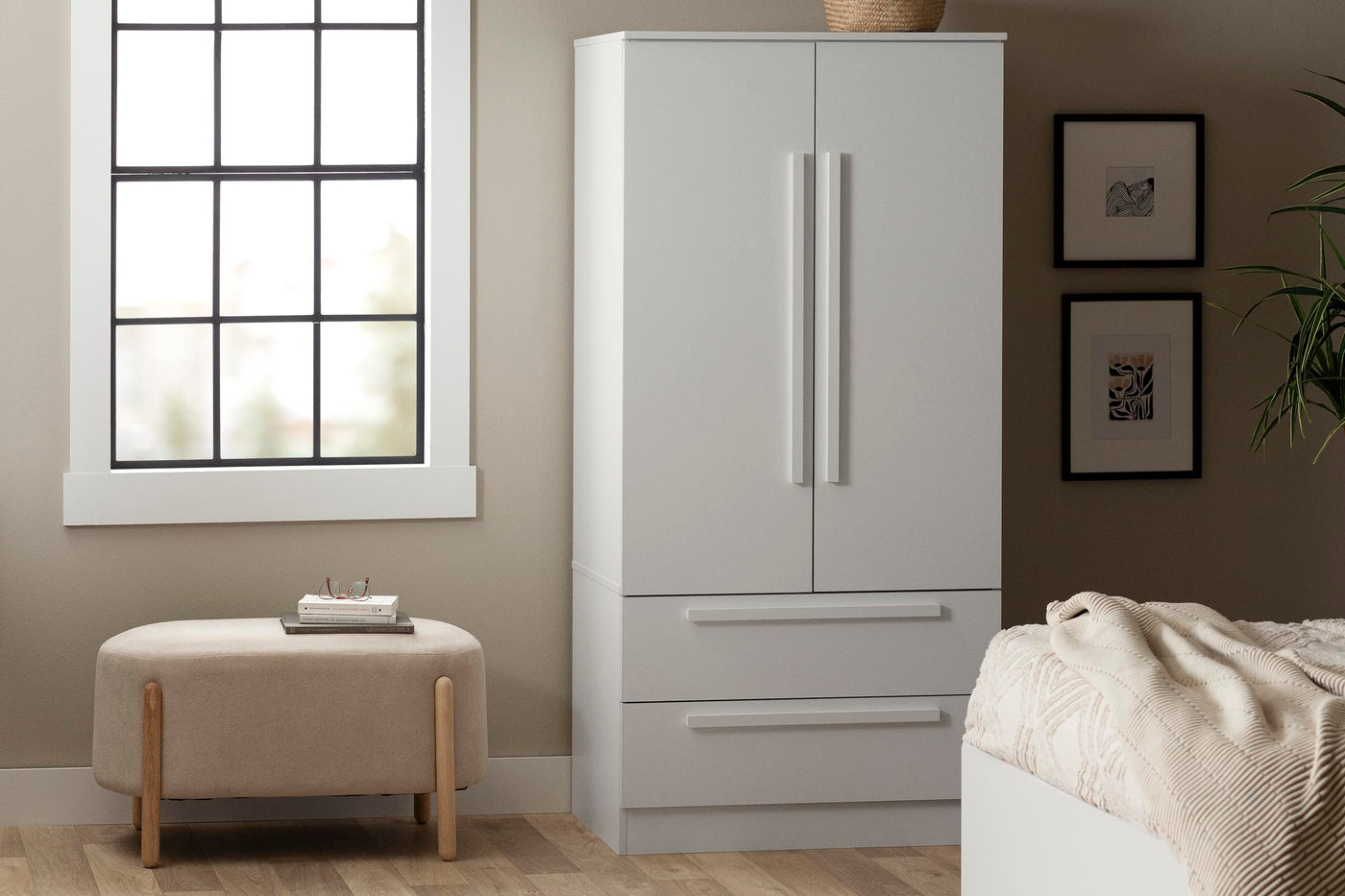 SMART STORAGE: Make the most of every inch with this wardrobe that features two spacious drawers, a metal rod, and adjustable shelves behind the doors for customized storage of all your clothes. | EASY ACCESS: Metal sliders ensure smooth opening and closing of drawers, allowing you to effortlessly retrieve what you need. | ELEGANT STYLE: The sleek lines and slim handles create a modern look that will naturally blend with your bedroom decor. | SAFETY STANDARDS: The well-being of your family is important to us. That's why our clothing storage units meet the tip-over safety standards required by the STURDY (Stop Tip-overs of Unstable, Risky Dressers on Youth) Act and features a drawer interlock system that allows only one row of drawers to be opened at a time. | Wipe with a dry cloth | 5-YEAR LIMITED WARRANTY: South Shore is proud to stand behind this wardrobe armoire with doors and drawers with an exclusive 5-year limited warranty. Shop with confidence knowing your purchase is always covered.