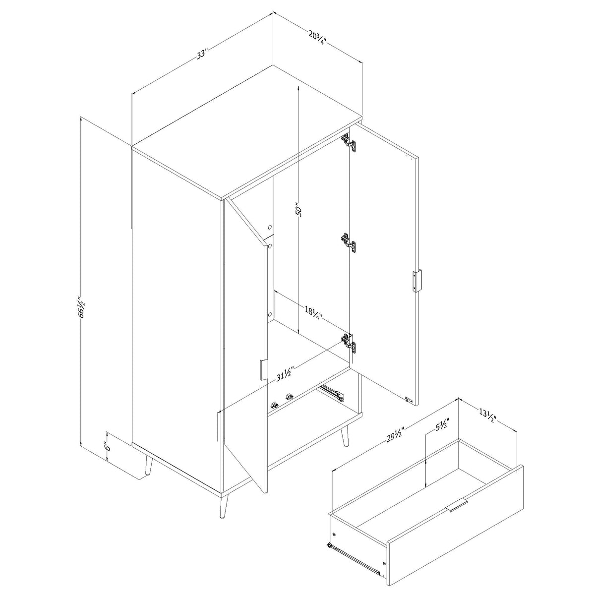 WARDROBE ROD AND LARGE DRAWER: This wardrobe armoire features a full-width rod and a sturdy drawer at the bottom. There's plenty of room to hang shirts, dresses and suits, and to store pajamas and t-shirts. | METAL HARDWARE: With its angled legs and slim metal handles, this highly refined piece of furniture is more than just practical, it's a true decorative element. | OPTIMIZE SMALL SPACES: Your room doesn't have a closet? No problem! This spacious wardrobe with its contemporary look will multiply the storage space in your room. | SAFETY STANDARDS: The well-being of your family is important to us. That's why our clothing storage units meet the tip-over safety standards required by the STURDY (Stop Tip-overs of Unstable, Risky Dressers on Youth) Act. | Wipe with a dry cloth | 5-YEAR LIMITED WARRANTY: South Shore is proud to stand behind this wardrobe armoire with doors and drawer with an exclusive 5-year limited warranty. Shop with confidence knowing your purchase is always covered.