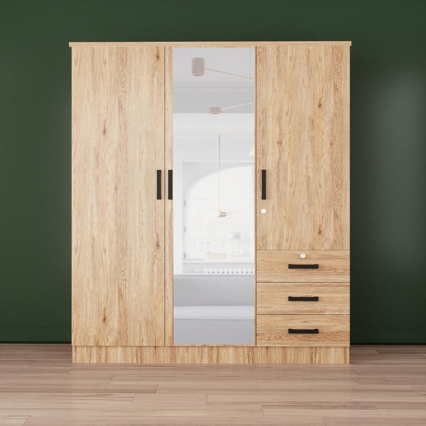 Violet Wardrobe Mirrored Door Closet 3 Doors and 3 Drawers (Natural Oak)