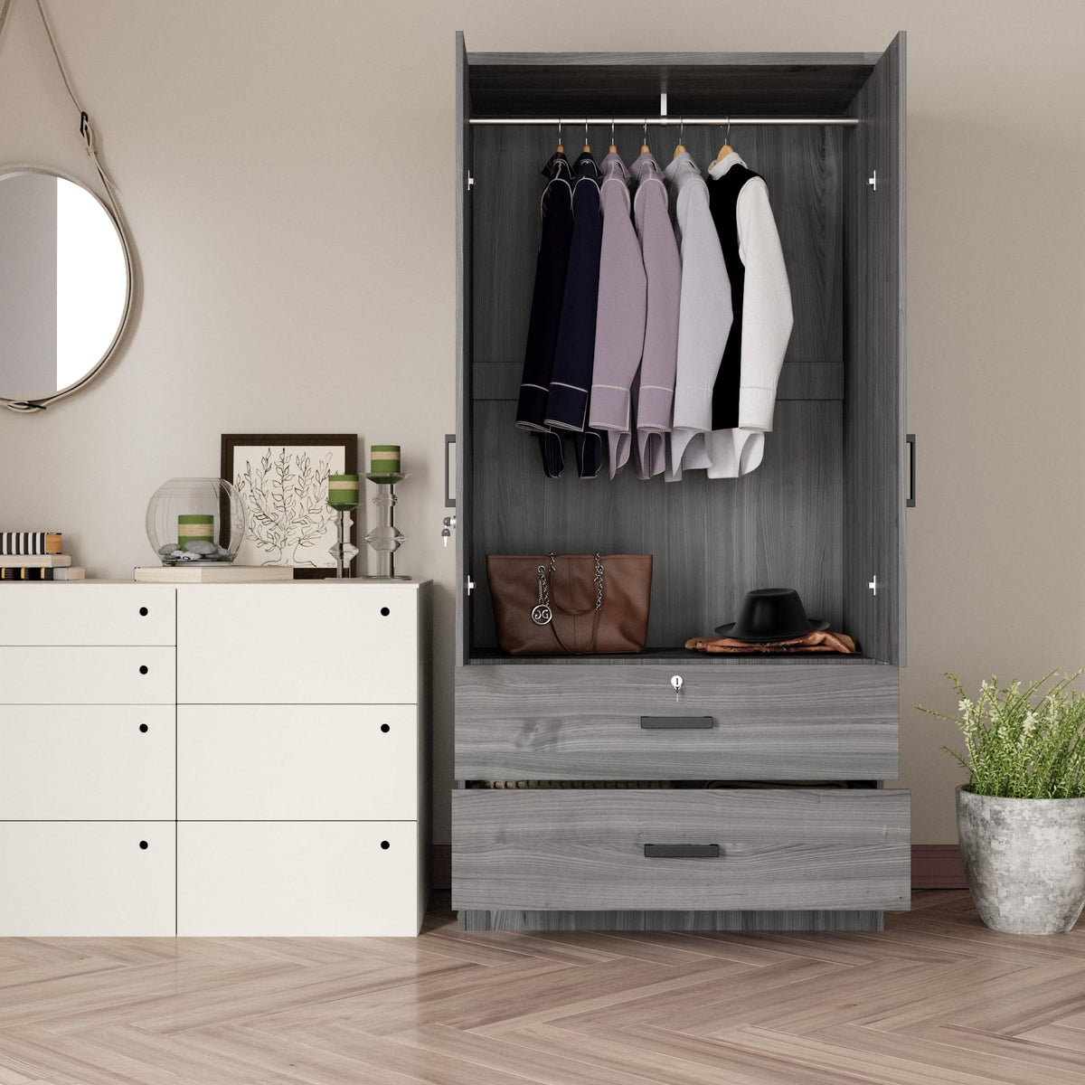Woodpeckers Furniture And Mattress 2-Door Closet with 2-Drawers (Grey)