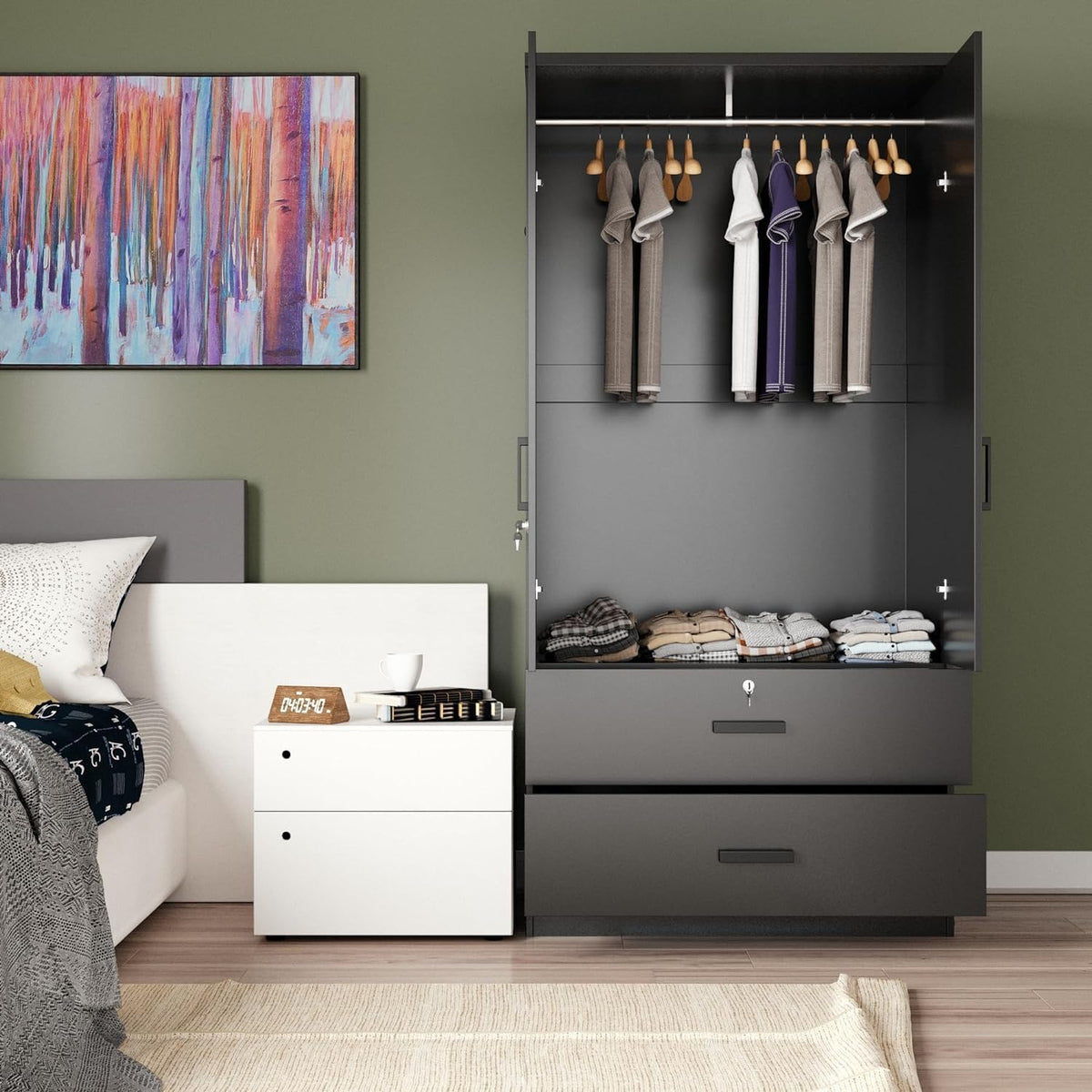 Elegant and versatile, the 2- Mirrored Doors Wardrobe Armoire with 2-Drawers is a must for any space-conscious bedroom. Heavy-duty garment rod behind lockable two doors is perfect for hanging your blazers, coats, and shirts. Two full-size drawers below the cabinet provide even more storage space to help keep you organized.