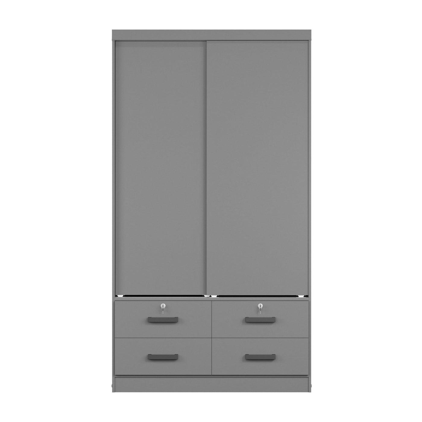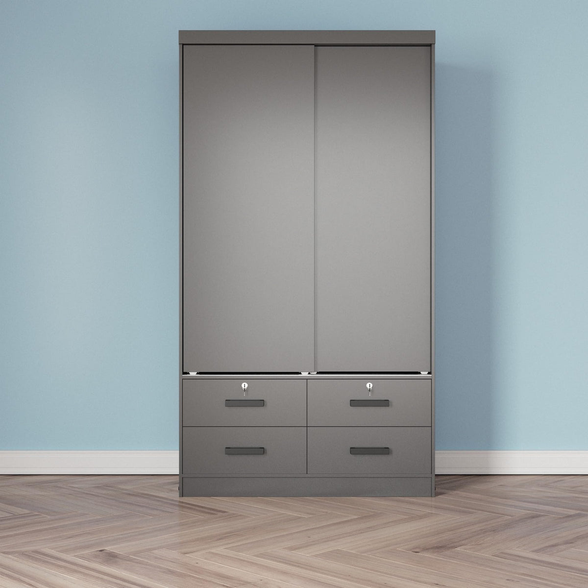 Bring the iconic energy of contemporary yet modern style to your bedroom or living room with the WPFurniture Sarah Modern Wood Double Sliding Door Armoire. Crafted with durable engineered wood for reliable support, this wardrobe comes with a splayed frame, clean edges, linear design, fade proof lamination, two sliding doors with a sturdy crossbar for hanging shirts, coats, pants, and jackets, upper shelf space, and four storage drawers for to organize smaller items. The perfect complement to your bedroom decor, organize your clothing today with the Sarah wardrobe cabinet. Assembly required.