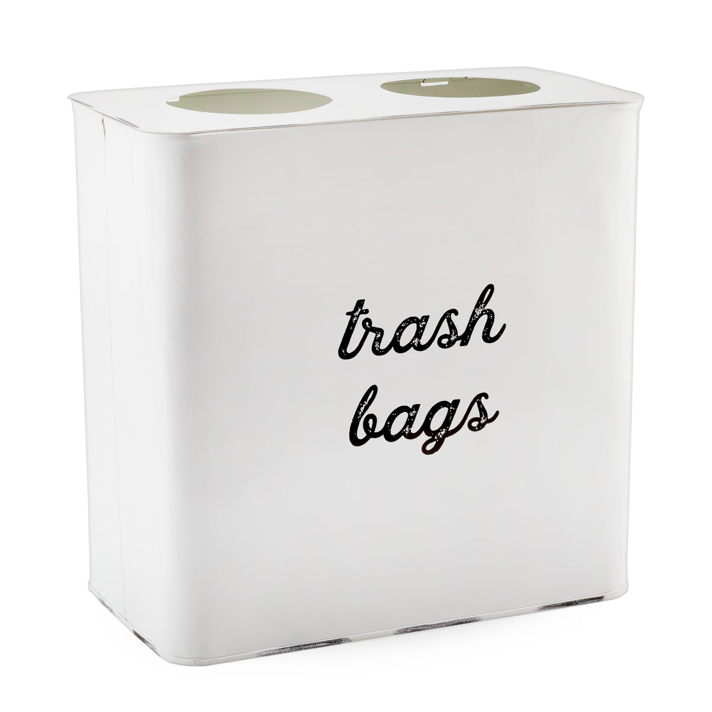 Auldhome Design Garbage Bag Holder; 2-Size White Enamel Trash Bag Dispenser Enjoy A Functional And Charming Addition To Your Kitchen. Crafted In Rustic White Enamelware, This Dispenser Effortlessly Complements Farmhouse-Style Decor. Designed To Hold Two Rolls Of Garbage Bags, Accommodating Both 30-Gallon And 13-Gallon Sizes, It Features A Convenient Lid With Round Openings For Easy Dispensing. Streamline Your Trash Disposal Process While Adding A Touch Of Vintage Flair To Your Space With This Versatile And Practical Trash Bag Dispenser From Auldhome Design. Also Available In White Distressed Enamel From Auldhome Design: Laundry Pod Dispenser, Lint Bin Holder, Dishwasher Pod Dispenser, Paper Towel Holder, And Many More Kitchen And Laundry Accessories. Features Size: 9.1 In. Tall By 9.4 In. Long X 5.1 In. Deep Interior Dimensions: 9 In. Deep, 9 In. Long, 4.5 In. Wide, Holds Trash Bags That Come In The Rectangular Boxes Around 9 In. Long X 4.5 X 4.5 In., Can Hold A Combo Of Approx. 30 Large Black Trash Bags (30 Gallon) And 45 Medium White Kitchen (13 Gallon) Trash Bags Or Two Rolls Of Same Size Bags Weight: 1.8 Lb. Material: Galvanized Iron With Ceramic/Enamel Coating Color: Distressed White With Black Script Saying Trash Bags Countertop Use, Under Cabinet Or Optional Wall Mount: Has Two Keyhole Openings For Wall Mounting, Screw / Wall Anchors Not Included Care: Hand Wash Only Made In India