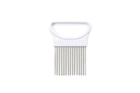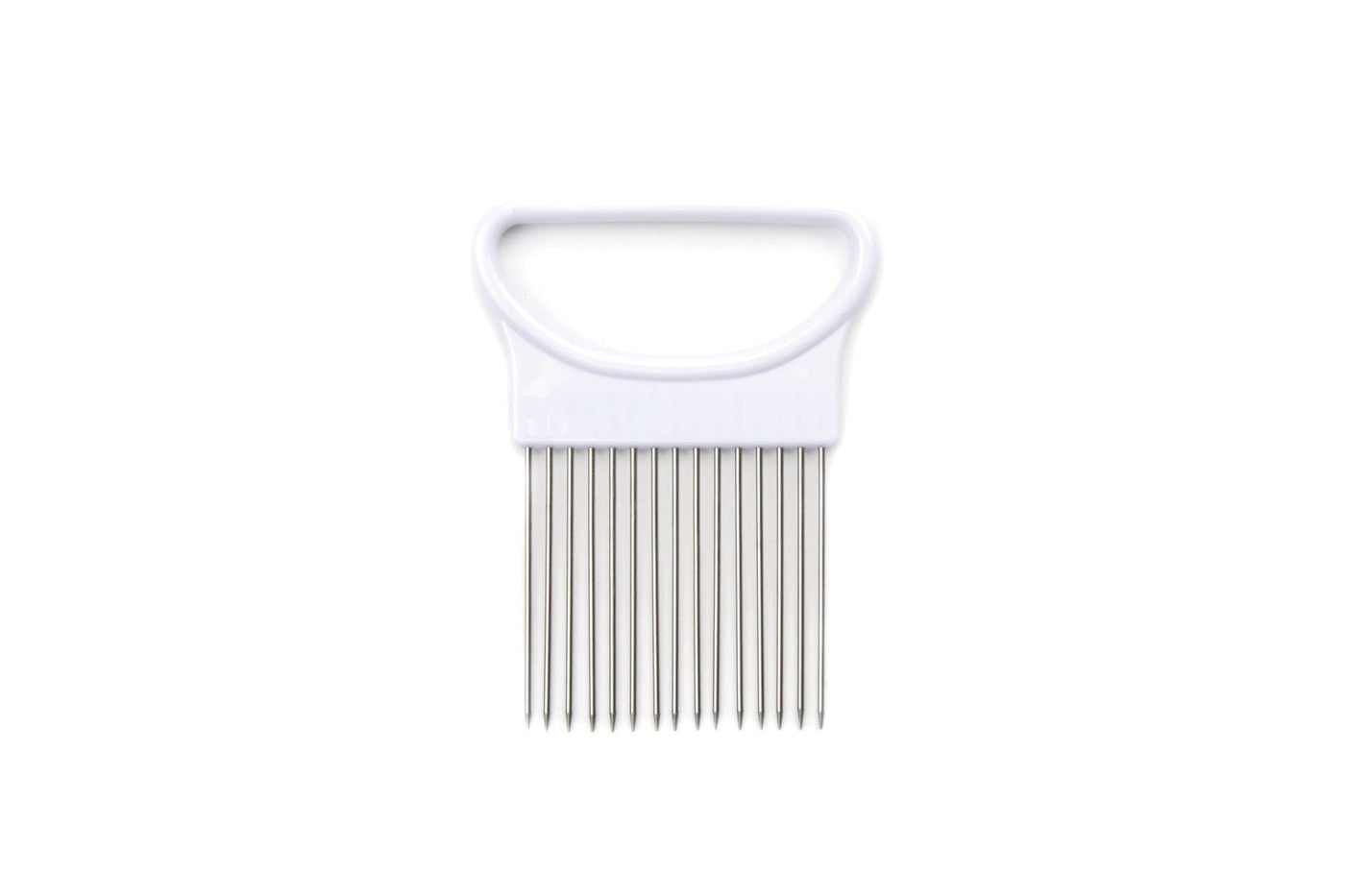Q: What materials are used in the construction of the Onion Holder?A: The Onion Holder is made of durable plastic for the handle and stainless steel for the picks, ensuring longevity and a non-slip grip while slicing.