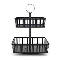 Q: What materials are used in the Gourmet Basics 2-Tier Rotating Storage Basket?A: The Gourmet Basics 2-Tier Rotating Storage Basket is handcrafted from high-grade carbon steel, ensuring durability and rust-resistance, making it suitable for both kitchen and bathroom use.