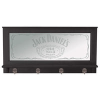 Decorate your home or office with this great looking Jack Daniel's pub mirror that combines style with function. Features subtle etched Jack Daniel's graphic on the mirror, black lacquer wood frame, and four custom tooled ''jack lives here.'' pewter coat hooks. Display shelf is great for small items. Dimensions: 28''W x 15''H x 3.5''D.