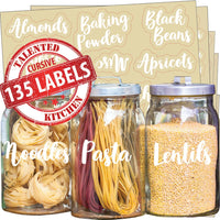 Q: How many labels are included in the set?A: The set includes a total of 135 preprinted pantry labels, featuring 8 numbered stickers, 6 ampersand signs, 5 plus signs, and 117 commonly used ingredient labels.