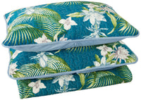 Southern breeze quilt set by Tommy Bahama features a bold leaf design with exotic flowers. Quilt features tones of pale plum and chambray blue. Quilt and shams indigo blue ground gives way to the beautiful floral design. Quilt reverses to a weave texture print in chambray blue that also trims the edges of the quilt and shams. An allover vermicelli quilt stitch adds texture and additional comfort to this soft, pre-washed cotton quilt set. 100Percent cotton materials. Create a tropical escape within your bedroom by adding a new Tommy Bahama quilt set. Machine washable.