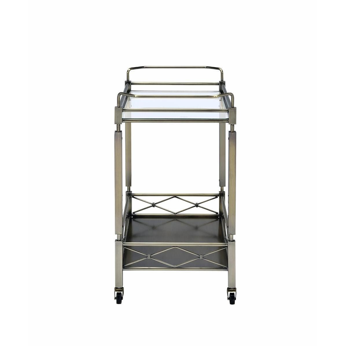 Add a touch of sophistication to your entertaining area with this matinees serving cart. Crafted with Metal in antique brass finish, it features 5mm clear tempered glass on top shelf. With 4 stable caster wheels, you could move around This serving cart from room to room effortlessly. Simple but elegant, this serving cart will sure to be a great addition in your room.