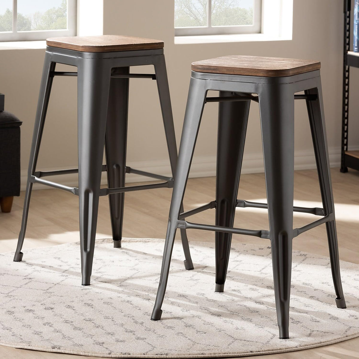 Baxton Studio Henri Vintage Rustic Industrial Style Tolix-Inspired Bamboo and Gun Metal-Finished Steel Stackable Bar Stool Set of 2