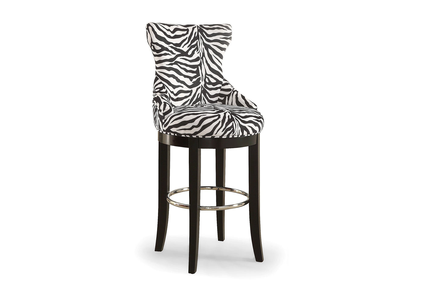The incomparably chic look of this zebra print fabric barstool is sure to elevate the design element in your home. Featuring a fully upholstered seat and back, this stool makes a statement that epitomizes sophistication. The Peace bar stool will be stylish and eye-catching decor upgrade. The striking design features a quality wood frame with sturdy flared legs and a stainless steel metal footrest in chrome finishing. The seat is padded and upholstered in zebra print polyester fabric. Great for kitchen counter or bar use. Made in China, the Peace requires assembly.