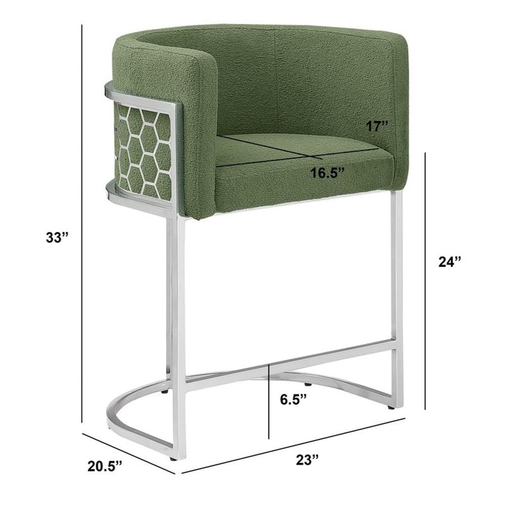 Best Quality Furniture Modern Barrel Counter Height Stools with Honeycomb Pattern, Teddy Fabric Upholstery - Green, Silver Chrome Finish