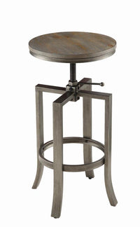 Make your move toward an industrial-influenced lounge space with this charming adjustable barstool. A round seat is backless, accenting its rustic charm. The seat rises and or lowers with a spin of its seat, allowing for easy customization to your space. Crafted in metal, the barstool features a slate grey finish over angled legs and a built-in footrest. Its round seat is wire brushed and finished in brushed nutmeg to truly reinforce its rustic, industrial vibe.