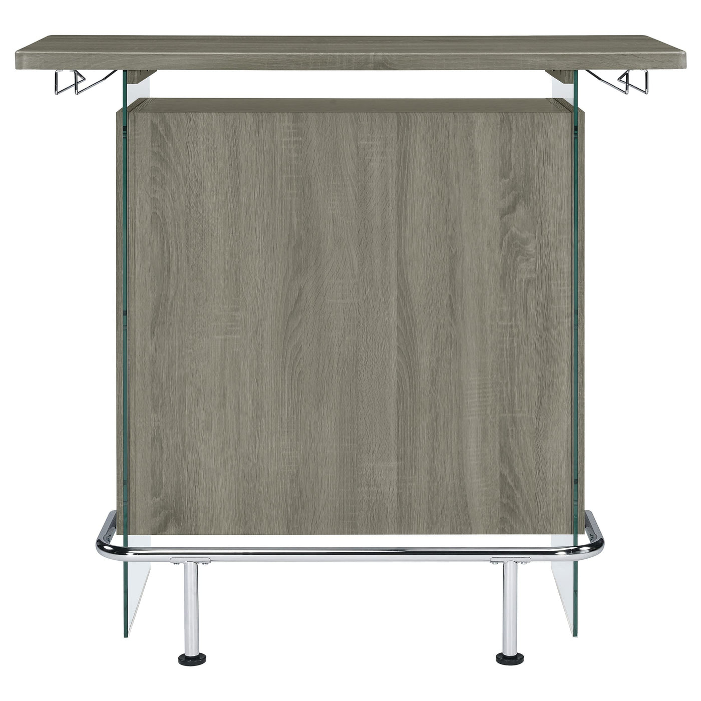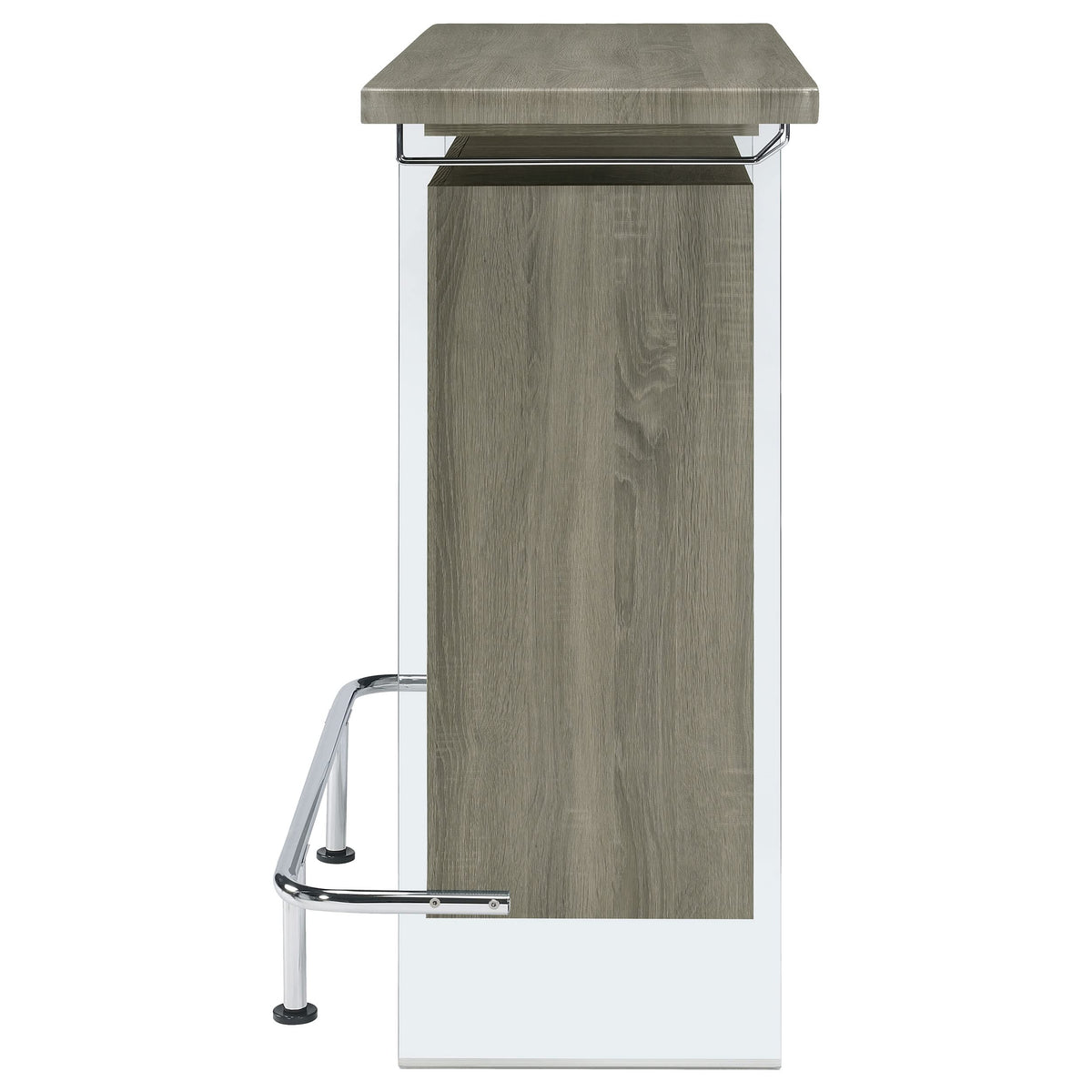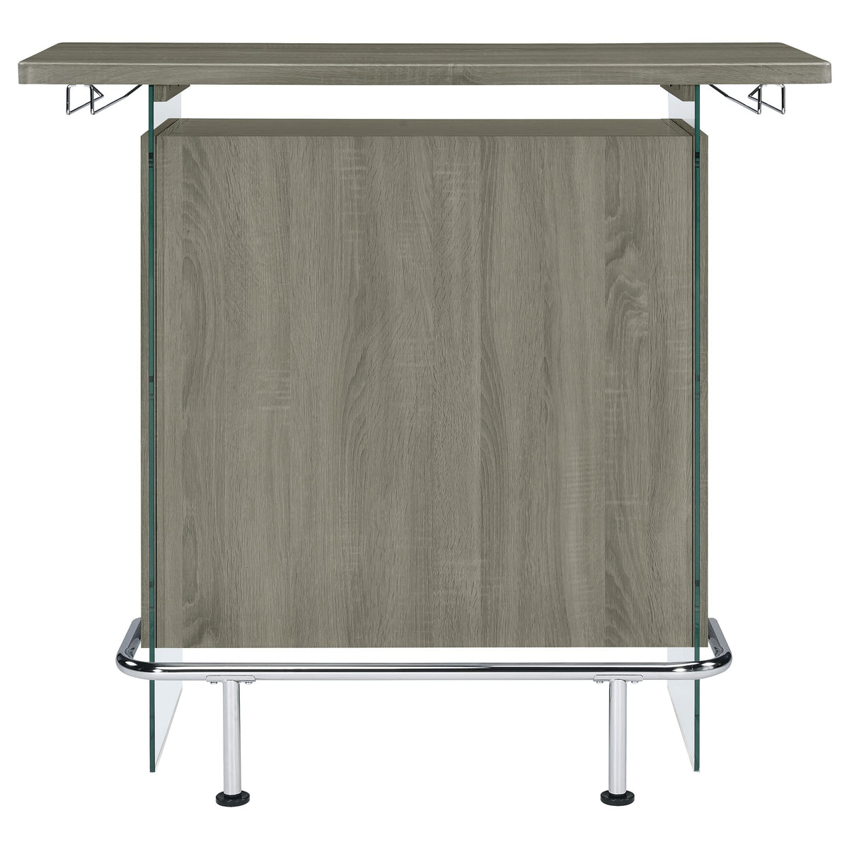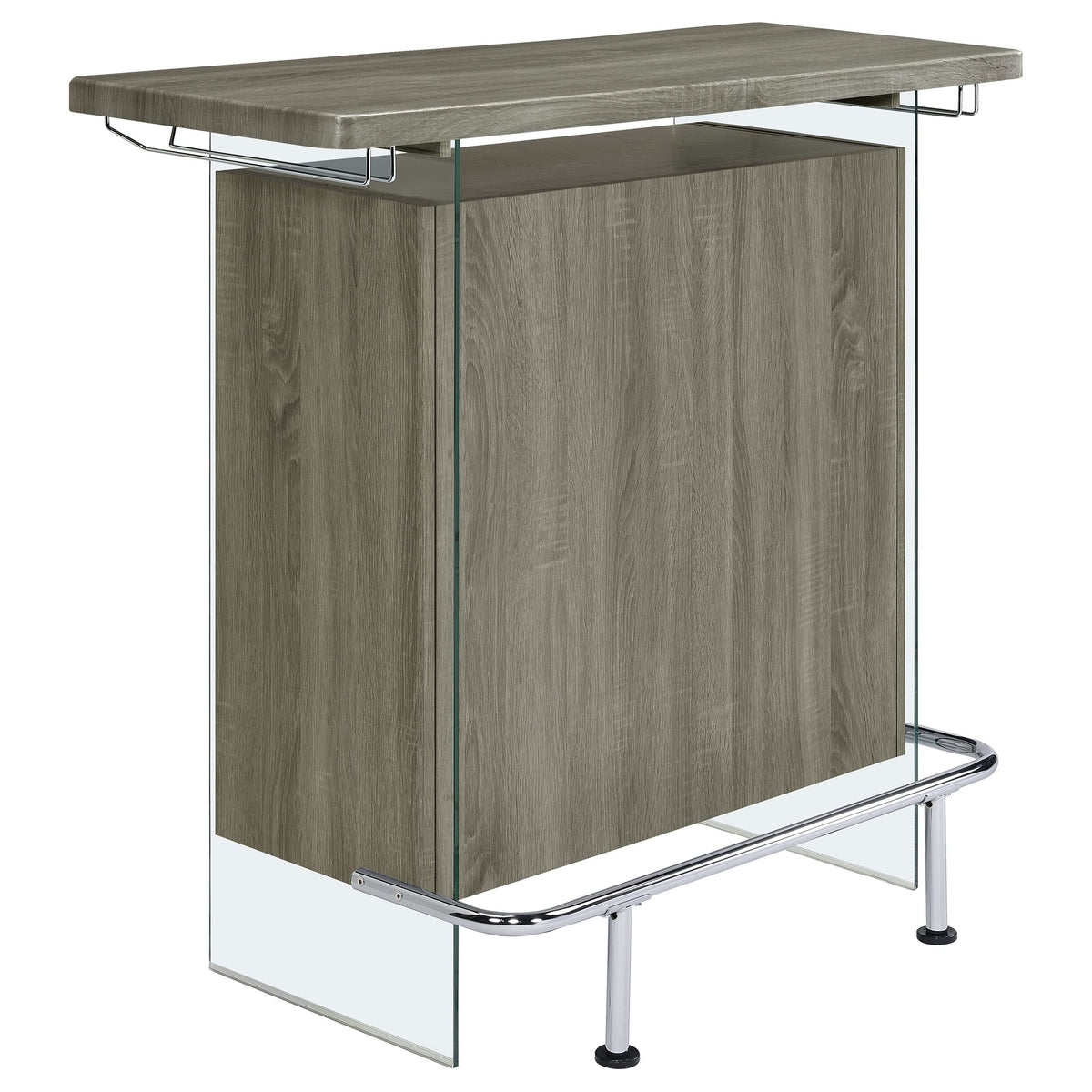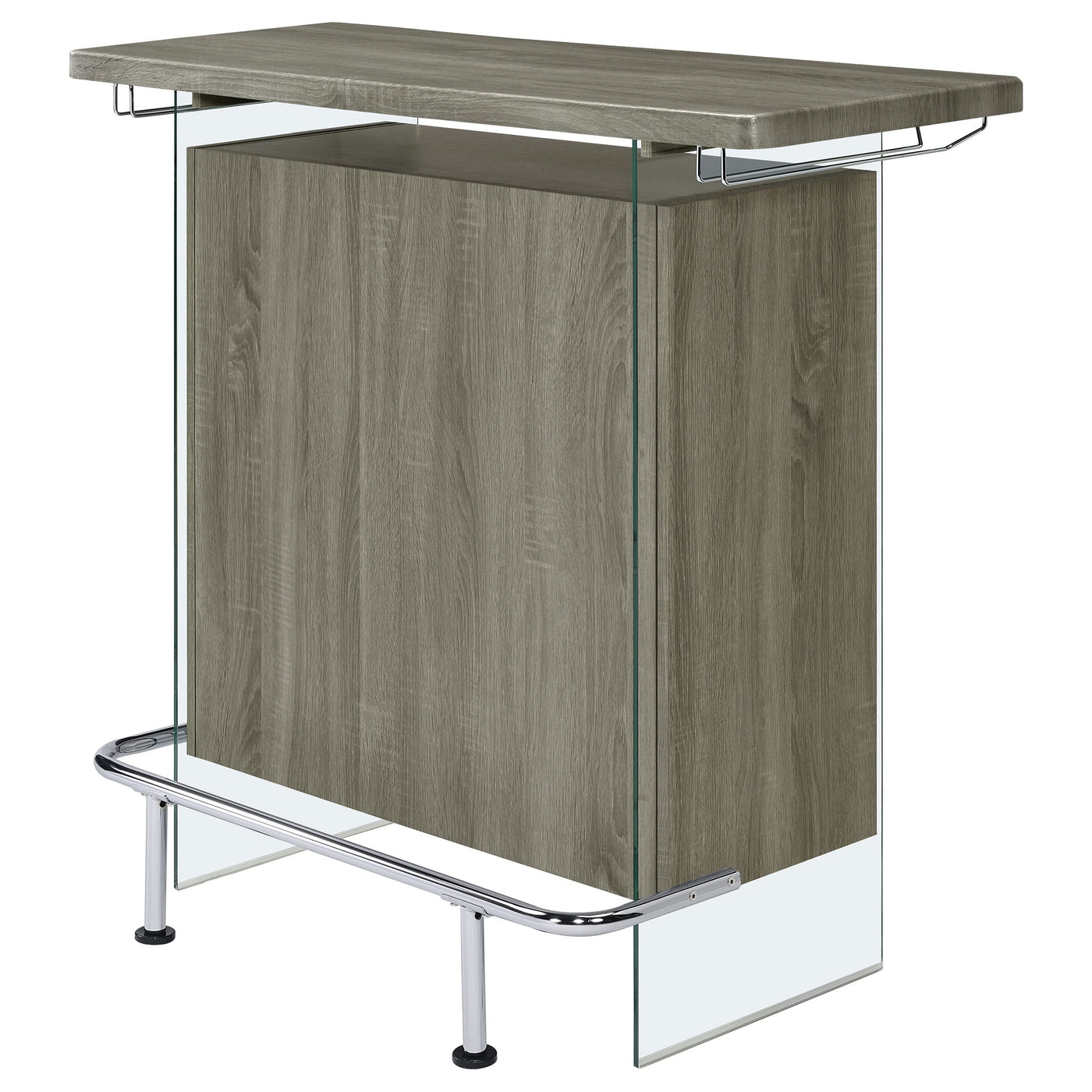 Elevate a multipurpose living room with this modern bar unit. A neutral finish, accented with polished chrome metal accents offers a striking design contrast. Supported and flanked by clear tempered glass side panels, this bar unit boasts ultra-modern elements as well for a dramatic feel. Compact yet highly functional, this bar unit also features ample storage space with six built-in open shelves for storing bottles, serving pieces and other mixologist must-haves. Tucked beneath the bartop along each side is a stemware rack for wine glasses and more.FeaturesModern front bar unit finished in weathered grey Thick clear tempered glass side panels with steel footrest electroplated in chrome Features six storage shelves and stemware racks Constructed with MDF, particle board, glass, and metalDimensions:BarAssembled Product: 47.25 inches wide x 22 inches deep x 44 inches high Weight Capacity: 300 poundsAt Coaster, we are your premier source for exquisite furniture, offering diverse styles to enhance every aspect of your life. Our passion for excellence drives us to innovate, crafting budget-friendly furniture that complements your lifestyle. Explore our brands for endless design inspiration and make your living experience exceptional with thoughtfully designed, affordable pieces that inspire a life well-lived.