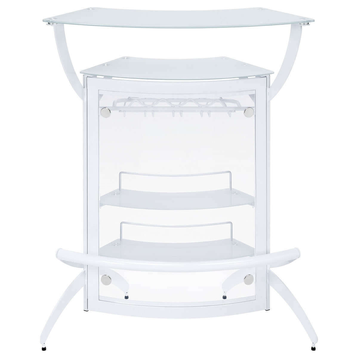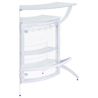 A sleek curved silhouette delivers a functional and aesthetic boost to this home bar unit, a great choice for fulfilling your casual entertainment needs. A modular motif fits the most custom contemporary design schemes, making it simple to host guests or family. White acrylic and glass construction stands out in any setting. A spacious exterior upper shelf is perfect for drink or snack prep, as a rack housed behind a glass door makes room for stemware and interior shelves store more bottles. Dressed up with mirror case trim and a mirrored case top shelf, it creates a glam influence with extra sparkle.FeaturesSleek curved silhouette provides functional and aesthetic boost to home bar unit Modular motif fits custom contemporary design schemes, perfect for hosting guests or family White acrylic and glass construction stands out in any setting Spacious exterior upper shelf for drink or snack prep, rack behind glass door for stemware, interior shelves store bottles Mirror case trim and mirrored case top shelf create glam influence with extra sparkleDimensions:Home BarAssembled Product: 33.5 inches wide x 21 inches deep x 41.5 inches high Weight Capacity: 300 poundsAt Coaster, we are your premier source for exquisite furniture, offering diverse styles to enhance every aspect of your life. Our passion for excellence drives us to innovate, crafting budget-friendly furniture that complements your lifestyle. Explore our brands for endless design inspiration and make your living experience exceptional with thoughtfully designed, affordable pieces that inspire a life well-lived.