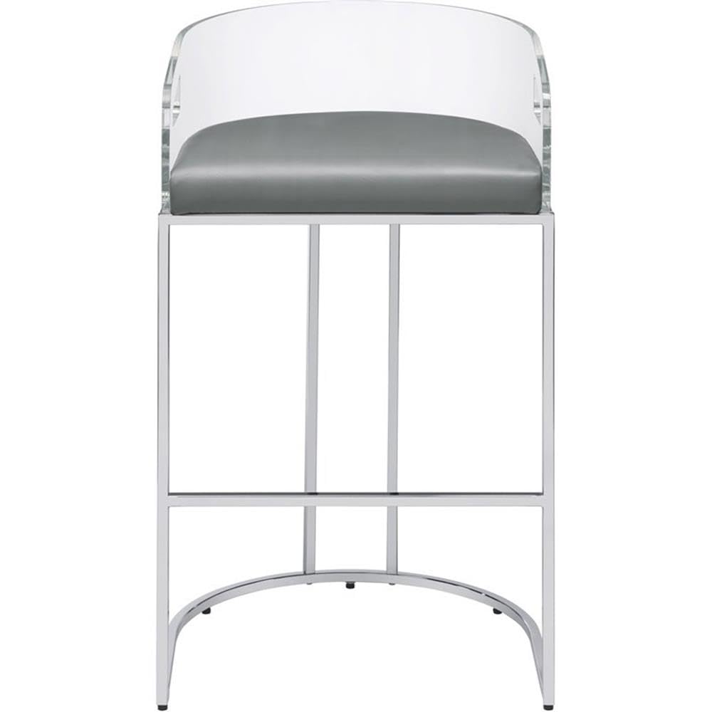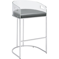 Ultra-modern with a retro-inspired vibe, this pair of stools make a striking piece to a dining room space. With a curved backrest in a clear acrylic material, each stool offers an open and airy design. Rest comfortably on a leatherette cushion as you dine or sip a cocktail. In addition, each stool is supported by a slim metal legs in a lustrous chrome finish and a base shape that mimics the rounded acrylic backrest. Pull up a pair of these stools to a kitchen bar or complete a compact home bar.