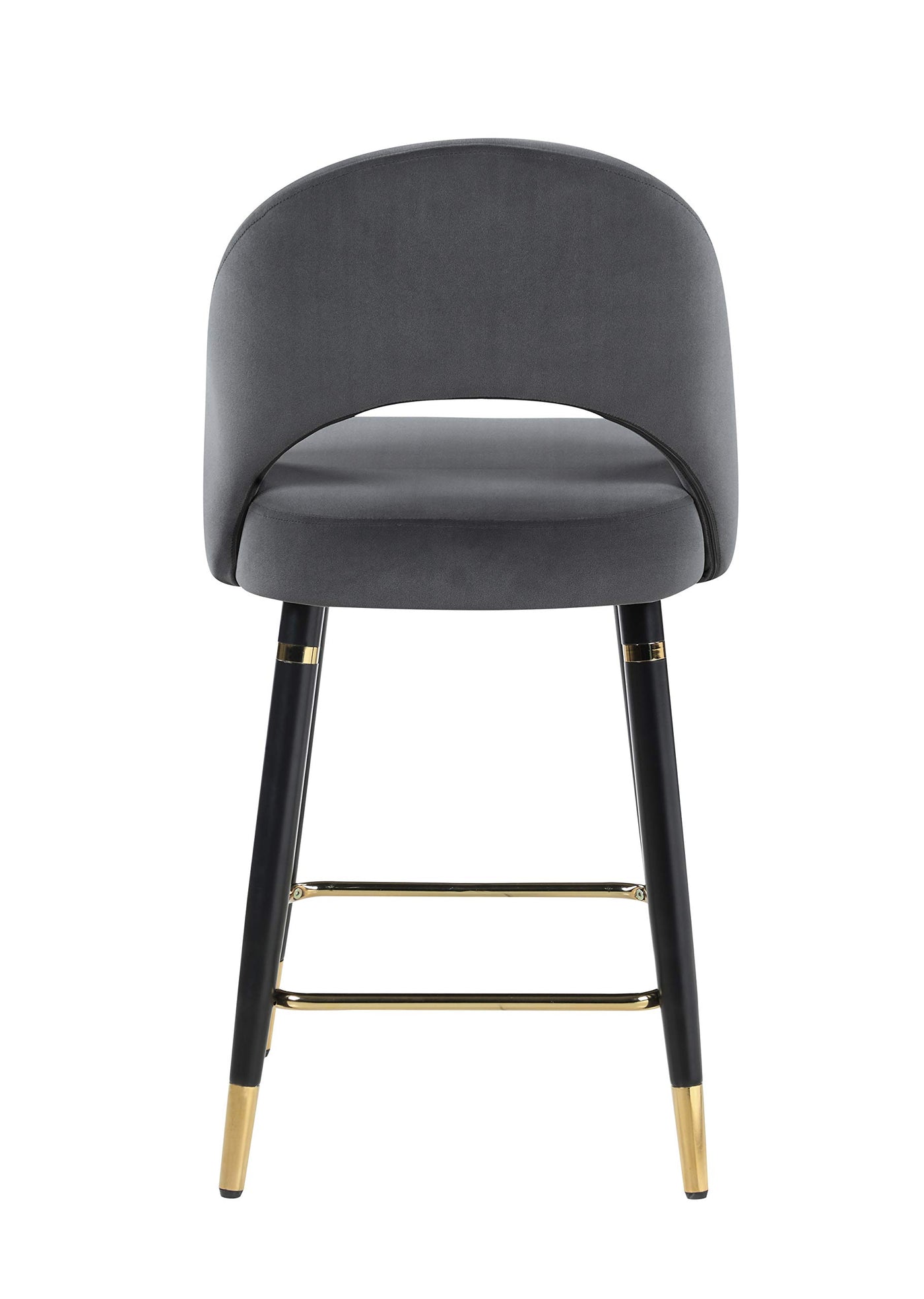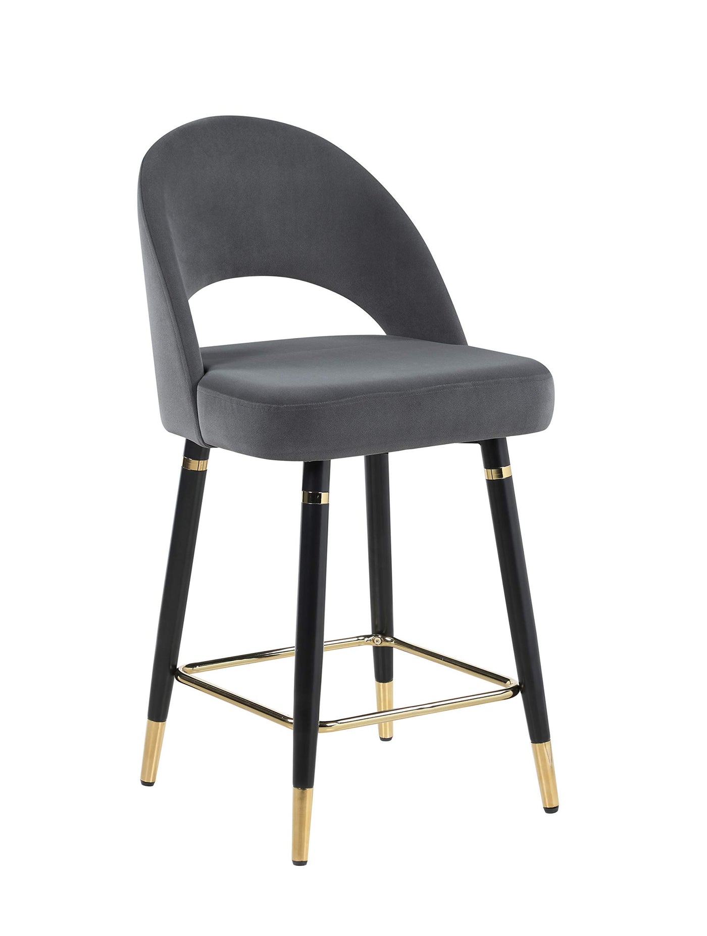 This set of two counter height stools features an elegant bucket style seat that lends a retro-inspired Mid Century modern look. Each stool offers long-lasting, supportive seats for each guest, wrapped in a velvety upholstery that complements numerous color palettes and adds a bold statement piece. Flared, tapered legs further lend to the vintage flair. Gold capped feet and a supportive foot brace offer a dramatic, regal Hollywood glam touch. Pull these stools up to a spacious entertainment room bar for cocktails.