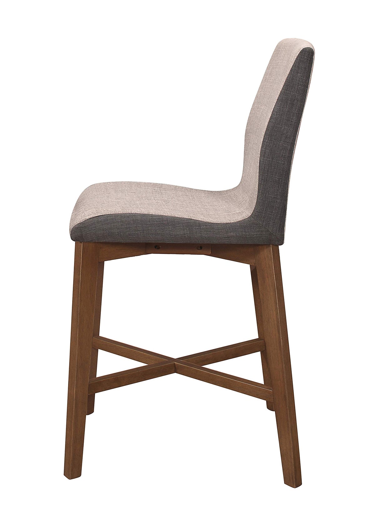 Place this pair of two counter height stools in a Mid Century modern home for a more retro-inspired look. Perfect for the green-friendly home, each stool offers a molded-like cushioned seat with comfortable and long-lasting foam filling. Each chair seat is also upholstered in a two-tone design of both light grey and dark grey fabric. Supported by tall and flared narrow legs, each chair also offers a foot brace for extra support. The natural walnut finish lends retro, mid-century vibe.