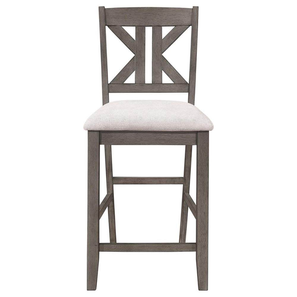 Create a put-together dining space that exudes classic country vibes. This counter height stool is beautifully designed with rich, rustic style in mind. The supportive seat back boasts an intriguing, cutout design with bold, geometric angles. The chair is topped with a plush, upholstered cushion for exceptional comfort and support. A subtle, barn grey finish completes the design with a charming, farmhouse inspired appeal.