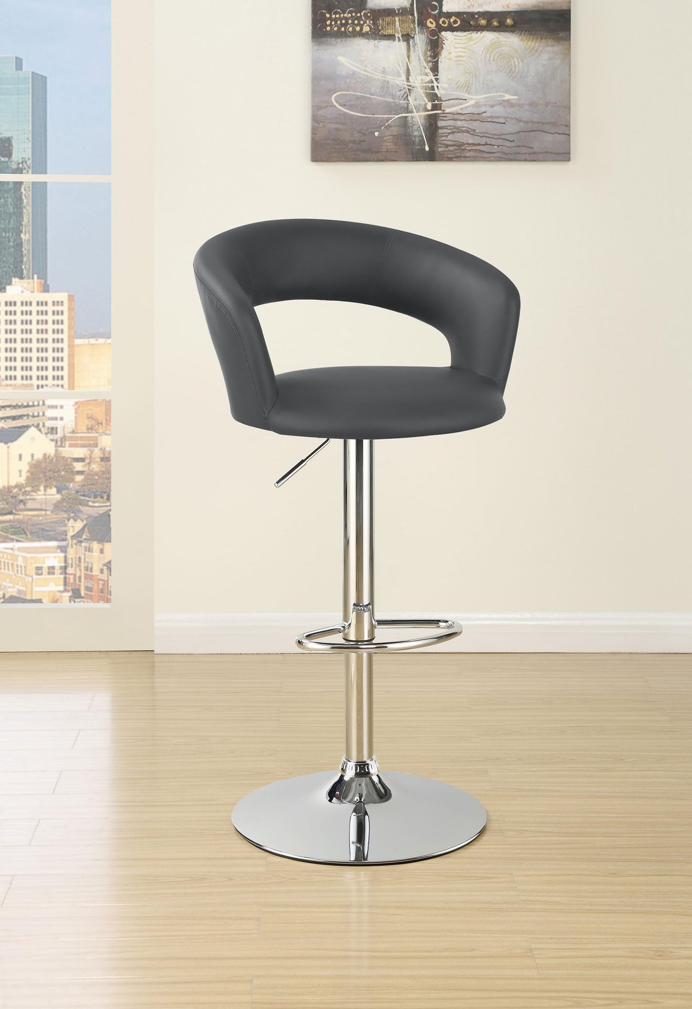 Sleek, elegant, and modern, this barstool is a fashionable choice. With comfortable seating and convenient height adjustability, it's also exceptionally versatile. Its frame is constructed from high-quality steel for plenty of stable support. Its seat is upholstered in smooth leatherette with a thoroughly appealing texture. A classic, chrome base rounds out its design with pleasing polish and dazzling shine.