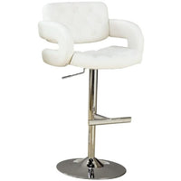 A rec room or home bar never had such chic bar seating. Chrome electroplated base and footrest seamlessly complement the leatherette upholstery. Padded seat and back with button tufted details commands attention and adds visual depth. Padded armrest allows you to lean comfortably in to make your point or sit back and nurse a martini. Trendy yet practical, bar stool is a modern enhancement to your home entertainment.