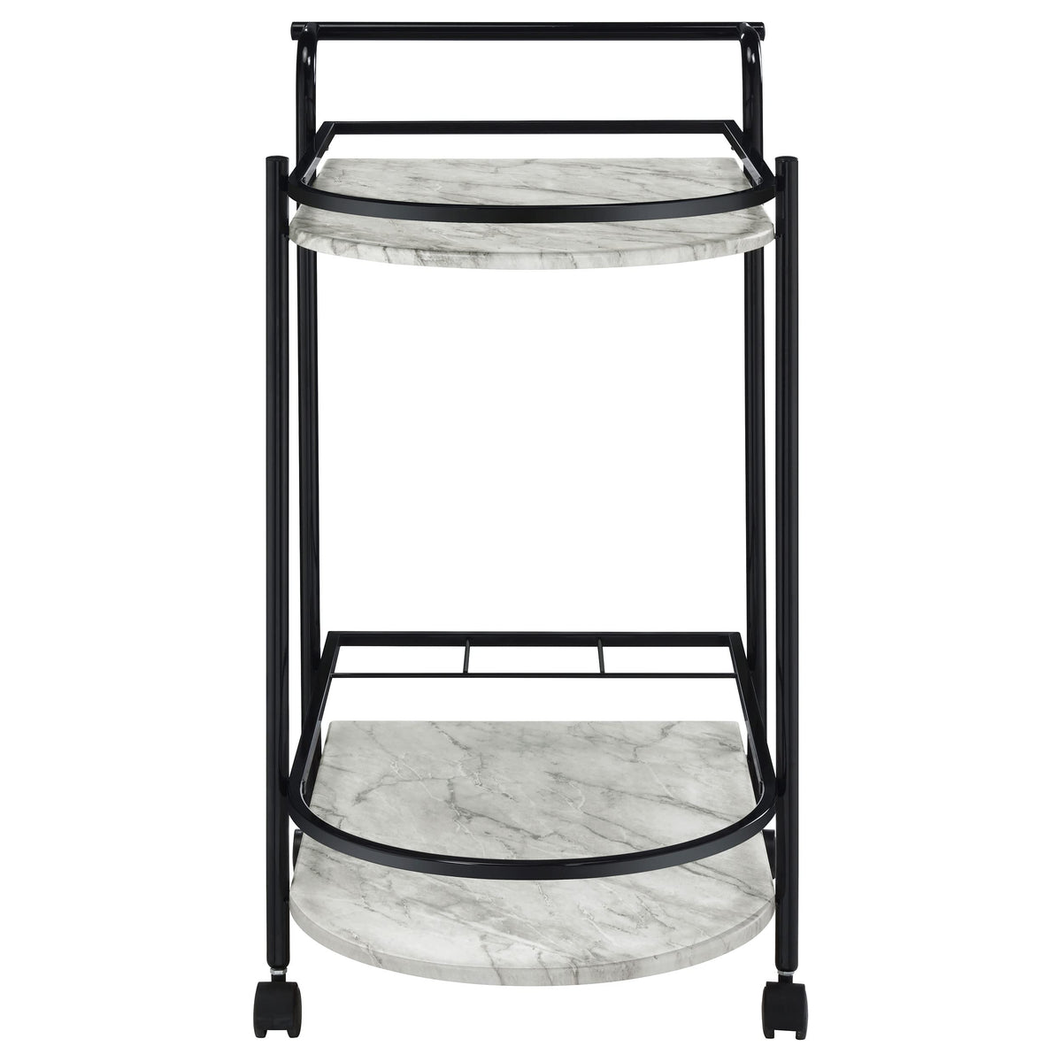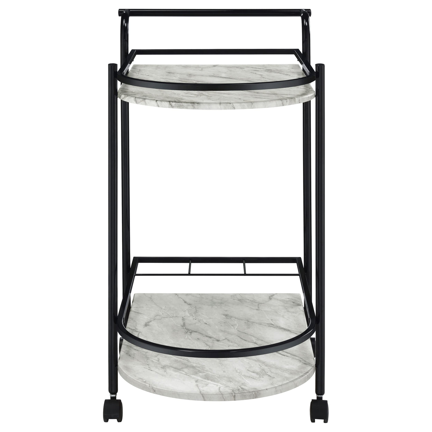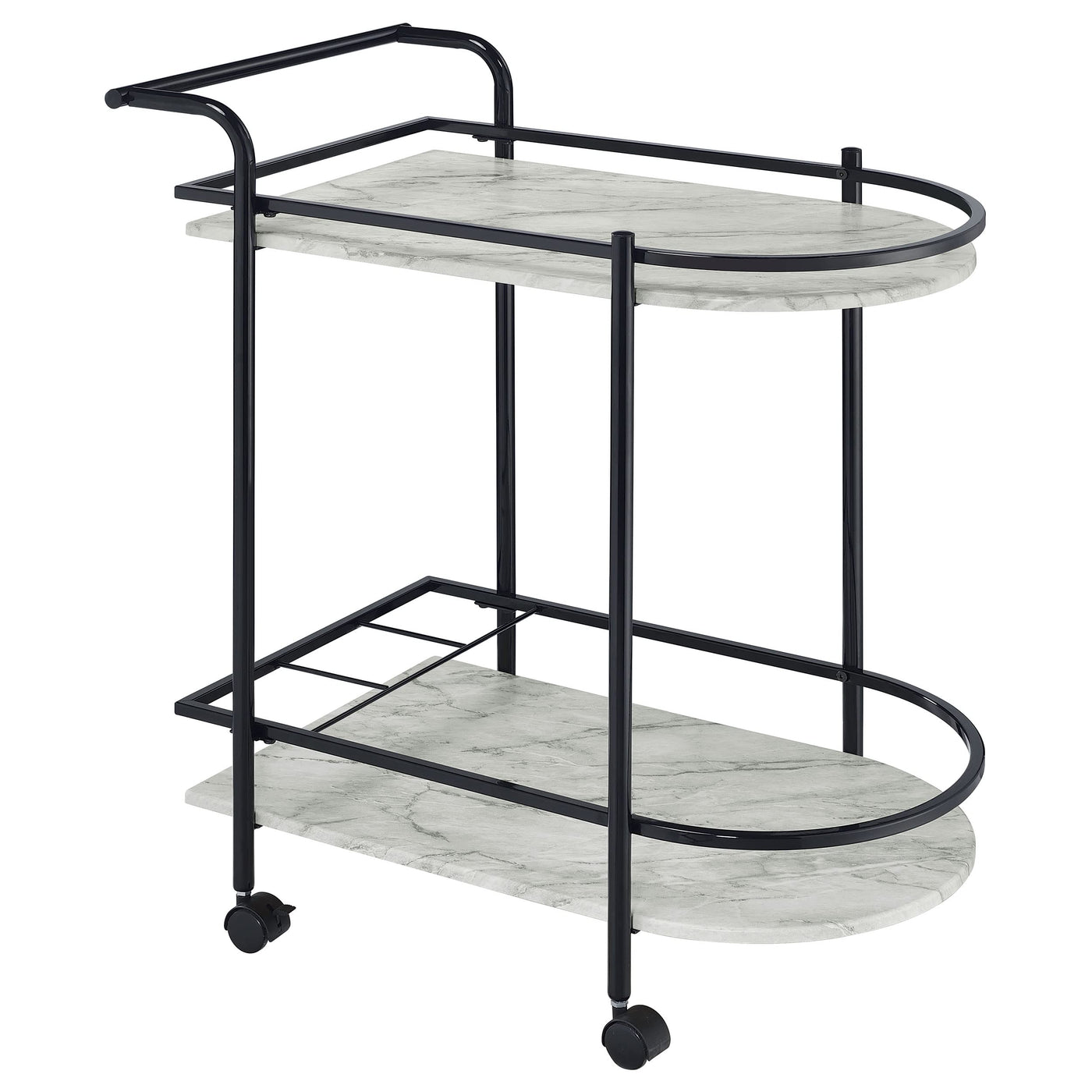 Invite guests over for an intimate soiree and serve up cocktails on this contemporary bar cart. Classic faux white marble shelves stack on top of one another, lending a traditional approach to its sleek modern silhouette. Rounded edges on one side add to the graceful appeal of the elongated shape. Designed in a metal frame with slim railing all around to keep bottles in place, this bar cart is ready to glide across floors. Lockable rolling casters secure it in place.