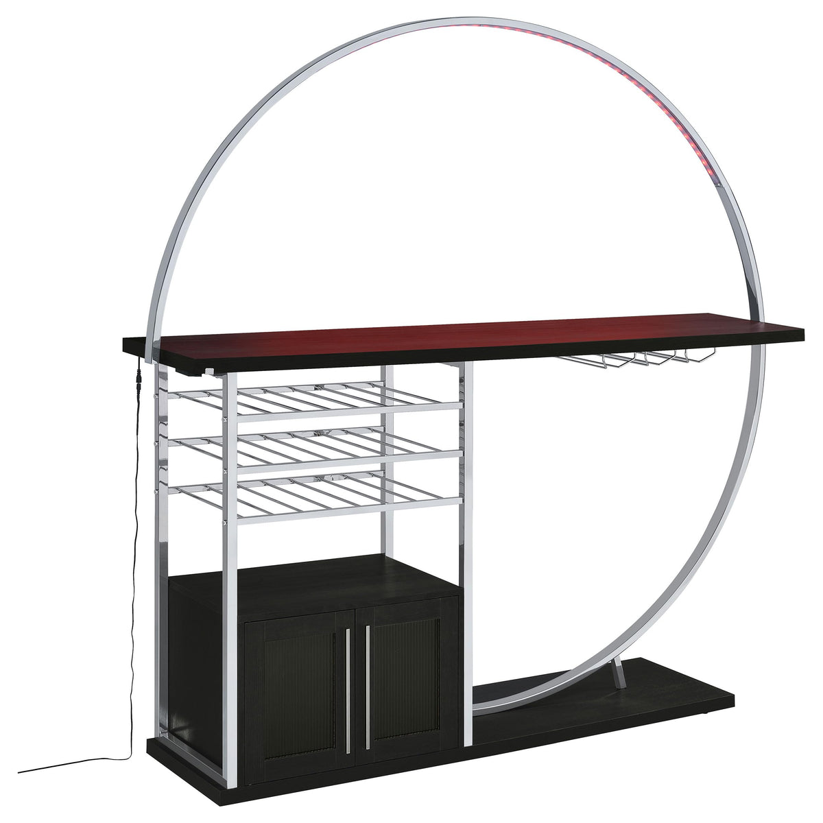 Transform your space into a beacon of style with this contemporary home bar that marries function with cutting-edge design. Bathed in the glow of LED lighting with a choice of eight vibrant colors, this piece becomes the centerpiece of any entertainer's haven. The sleek chrome electroplated metal frame supports a durable composite wood tabletop, perfect for hosting an array of glasses and spirits. Below, a two-door cabinet conceals essentials, while three tiers cradle up to 21 bottles of your finest wine. With a built-in stemware rack, this bar doesn't just store your collection, it showcases it, making every occasion a toast-worthy affair.
