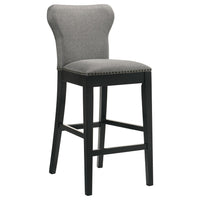 Slide this contemporary stool up to your dining space for a classical touch. Perfect for transitional dining areas and homes, this stool offers total comfort and stability with footrests and an upholstered seat. With a wingback style design, the seat is wrapped in a soft gray fabric lined with a bronze nailhead trim that offers a traditional touch and elegant detail. Resting on long tapered legs in a bold black finish, this stool offers a neutral, contrasting color palette that also lends itself nicely to modern farmhouse homes. Place it in a rustic lodge or lakeside retreat for a chic, sophisticated flair.