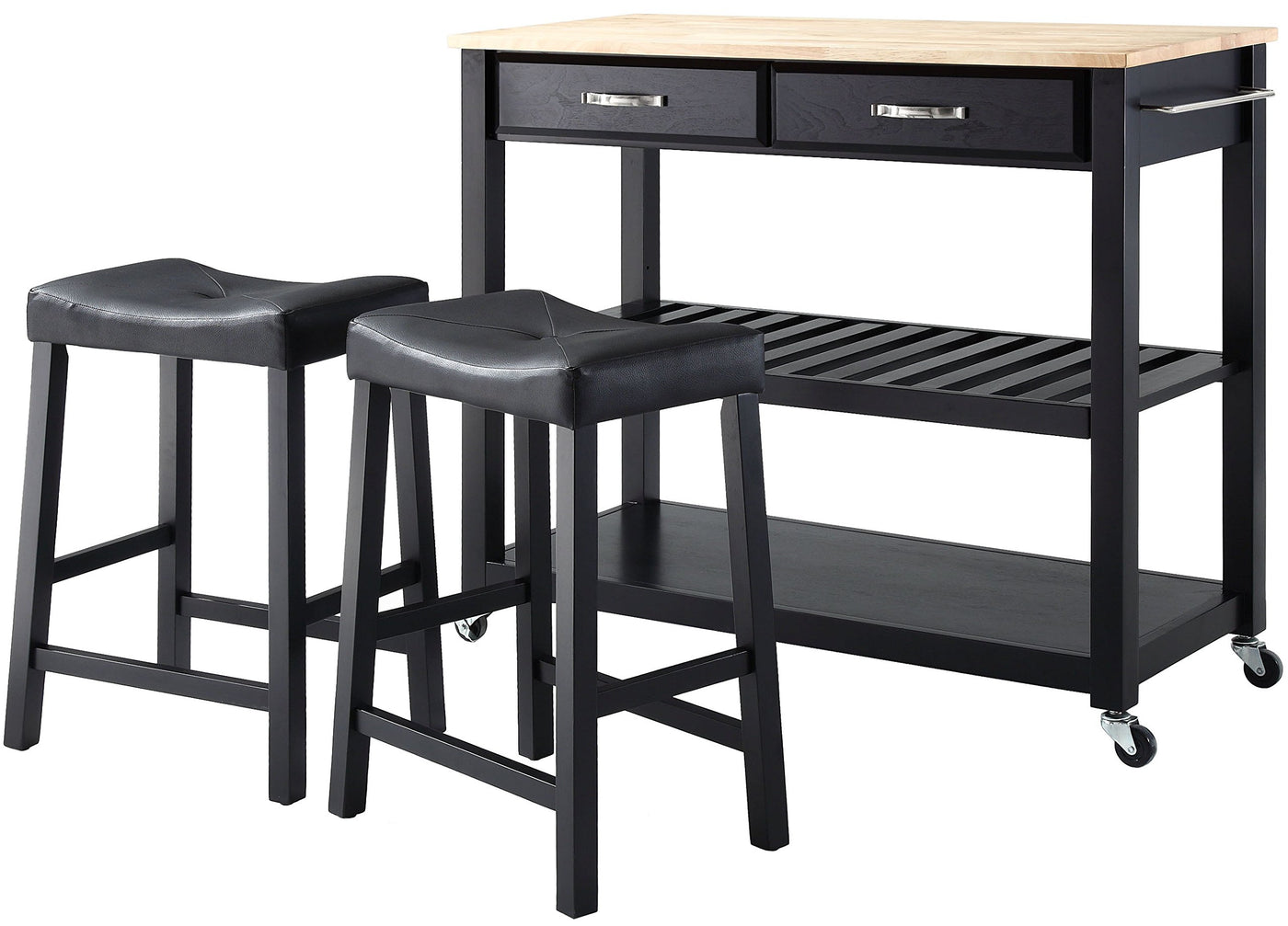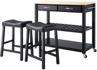 The Kitchen Prep Cart with Saddle Stools offers a great combination of kitchen storage, food prep, and casual dining. This mobile kitchen cart features four sturdy casters, including two that lock to provide a stable food prep or dining surface. The slatted shelf is ideal for wine storage and can be removed providing leg space for diners and a place to tuck away the Saddle Stools. Two large storage drawers can store utensils and other small kitchen items. The Saddle Stools provide a comfortable spot to sit for a cup of coffee or a quick meal on the beautiful wood countertop. The Kitchen Prep Cart with Saddle Stools is a must-have for your kitchen or dining area.