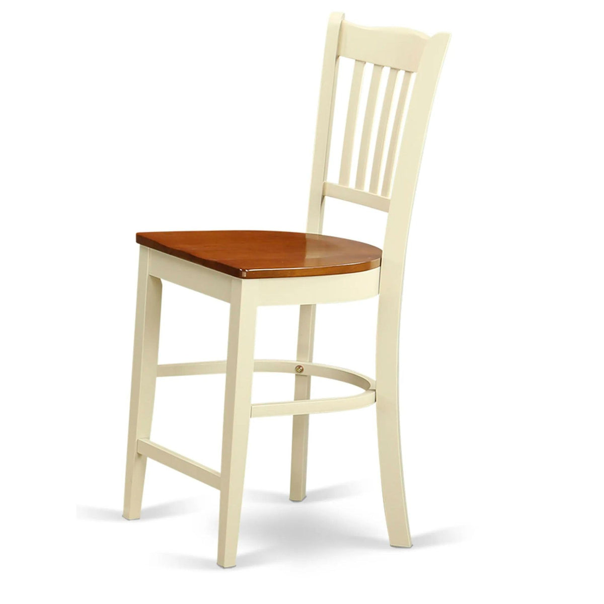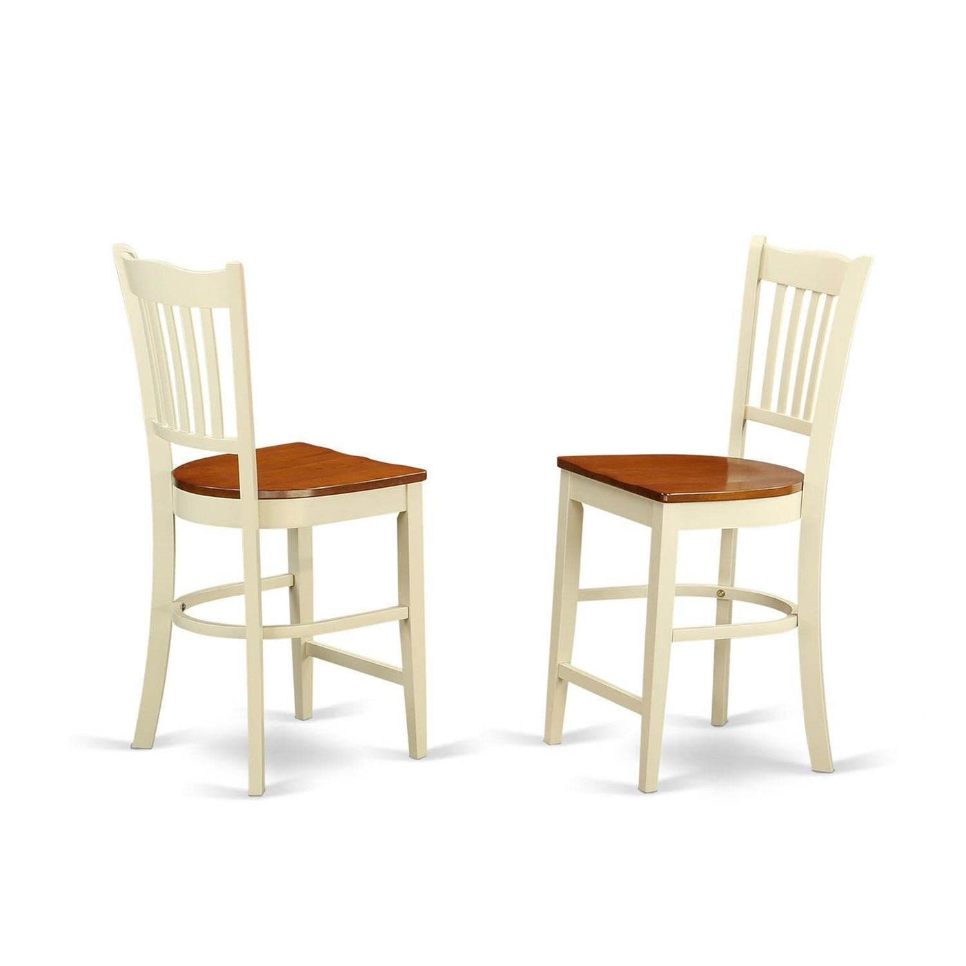 EAST WEST FURNITURE - GRS-WHI-W - COUNTER HEIGHT BAR STOOLSEnhance the sophistication of your dining area with our exquisite Groton Back counter height bar stools. The unique design of these outdoor chairs adds charm to any dining table. The counter-height dining room chairs feature Cherry Wooden seats and Buttermilk wooden legs. A premium finish has been applied to these chairs, creating a striking appearance that enhances the elegance of any dining room. These chairs are designed with versatility in mind and can seamlessly complement a variety of home decors, ensuring long-lasting style and appeal. The solid wood Back of these counter height chairs ensures comfortable support for your back. Crafted from high-quality Asian Hardwood (Rubber Wood), the frame of these bar stools offers exceptional strength and stability. Furthermore, the superior quality wood used for the comfortable seat enhances both the appearance and sitting experience. With their durable hardwood structure, comfortable wooden seat and back, and sturdy high legs, these bar stools bring a modern touch to your dining room while providing excellent stability and back support. Thanks to their ideal dimensions, these counter height chairs are easy to transport, clean, assemble, and adjust their placement. The timeless design of this set of two bar stools seamlessly complements any decor, and the smooth wooden seat ensures user comfort.PRODUCT FEATURES: Seat: Wooden Leg and Back Color: Buttermilk Dimensions: Length: 20; Width: 17; Height: 42.Includes: Set of 2 Counter Height Chairs.