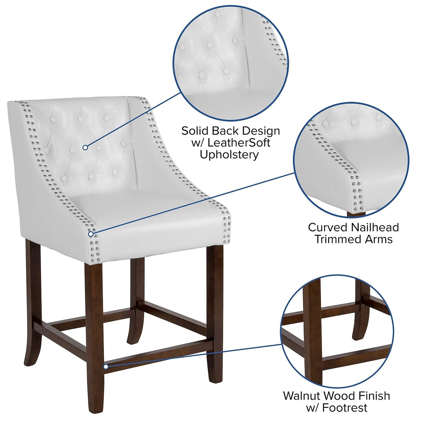Flash Furniture Carmel Series 24" High Transitional Tufted Walnut Counter Height Stool With Accent Nail Trim In White Leathersoft