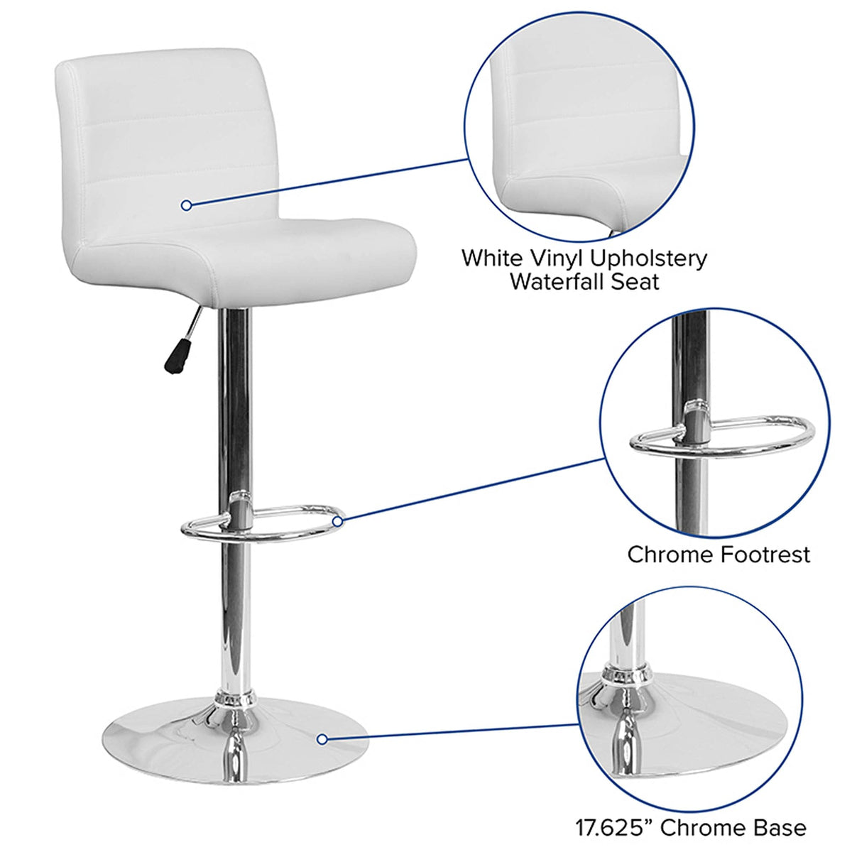 Come in and sit a while in this splendid white adjustable height barstool with exposed embellished stitching on the back. This stylish stool provides added comfort with the waterfall front seat, which is designed to remove pressure from the lower legs and improve circulation. The easy to clean vinyl upholstery is an added bonus when stool is used regularly. The height adjustable swivel seat adjusts from counter to bar height with the handle located below the seat. The chrome footrest supports your feet while also providing a contemporary chic design. To help protect your floors, the base features an embedded plastic ring.
