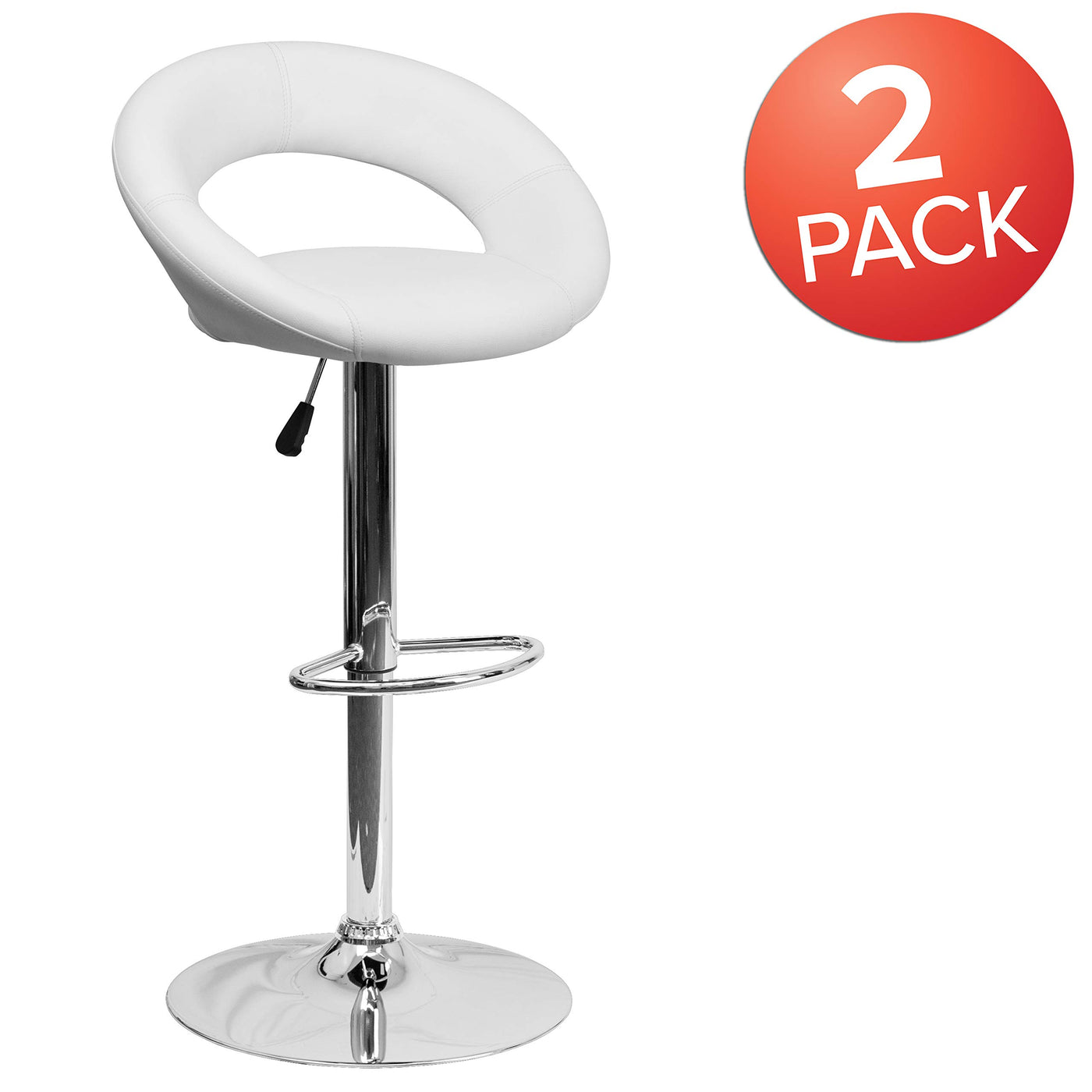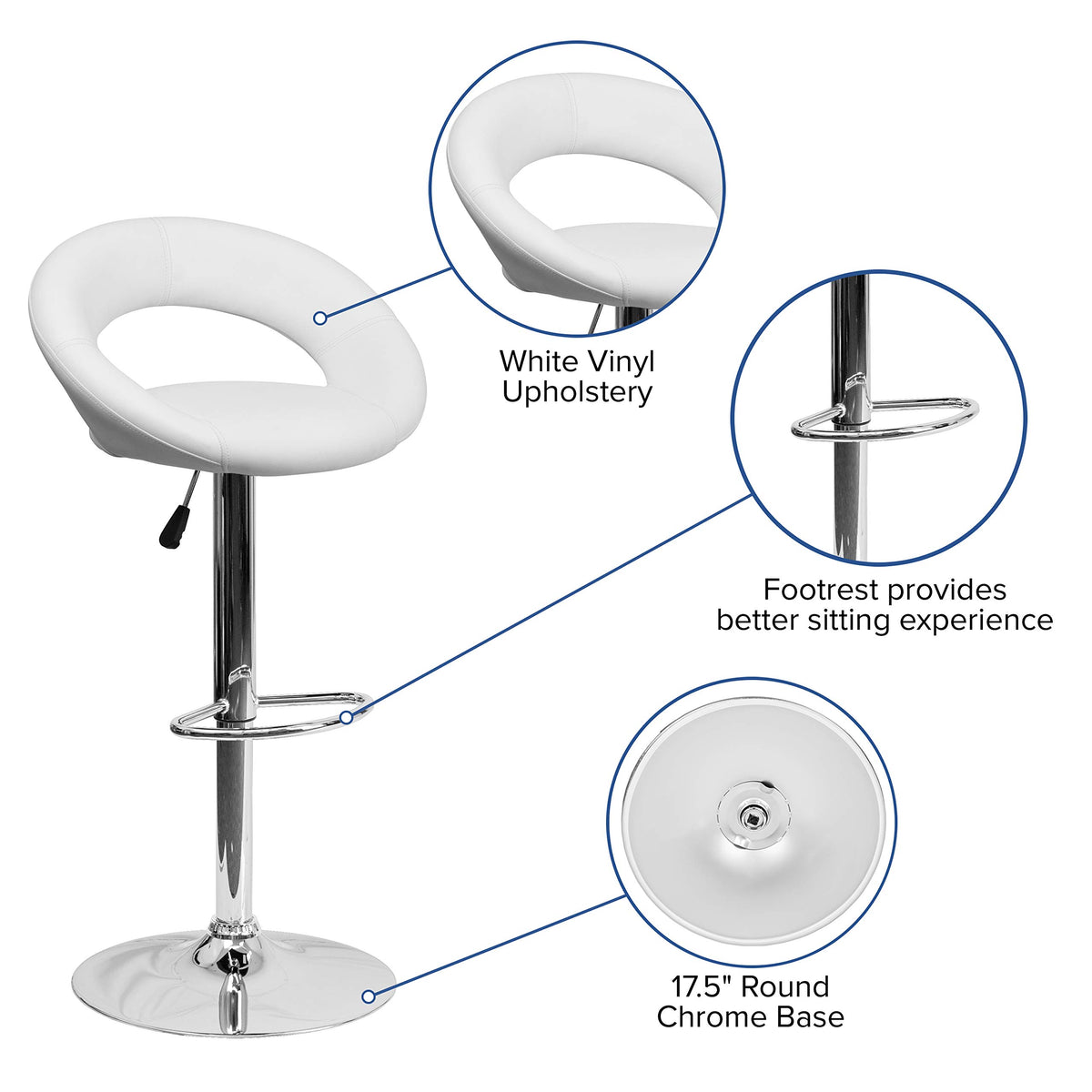 Simple meets significant in this sleekly rounded, white orbit-style back adjustable height bar stool. The forward thinking design and curvy silhouette make this adjustable stool a perfect complement to any room. The orbit shaped back support and round seat of this dual use stool is upholstered in a durable, easy to clean vinyl upholstery. The height adjustable swivel seat adjusts from counter to bar height with the handle located below the seat. The chrome footrest supports your feet and relieves pressure from your legs while also providing a contemporary chic design. To help protect your floors, the base features an embedded plastic ring.