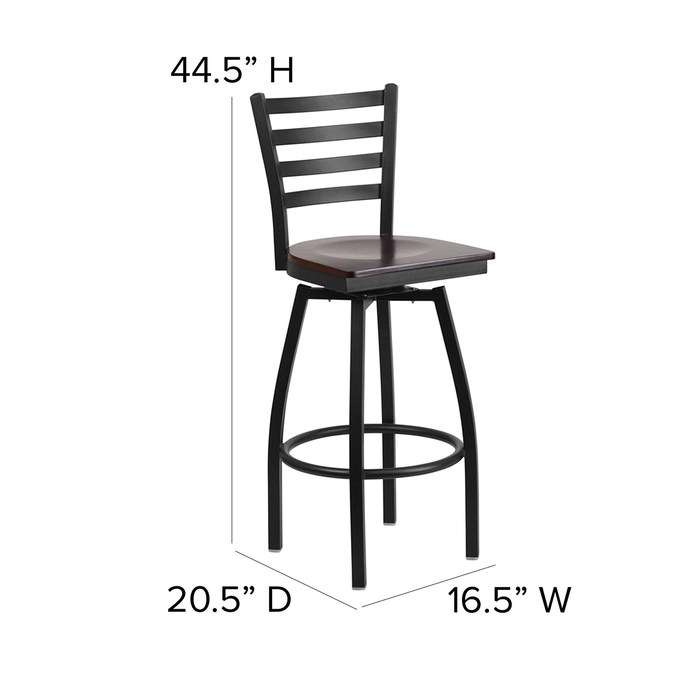Allow customers to access the bar and bar height table at your restaurant easily with a swivel barstool. Commercial furniture needs to be durable and low maintenance so metal barstools are a popular choice for furnishing restaurants, pool halls, lounges, bars and other high traffic establishments. This barstool is easy to clean, which is an important aspect when it comes to a business. Built to withstand the everyday hustle and bustle in the restaurant and hospitality business, these dining stools will also look great in your home. The beautiful wood seat and ladder back design will keep guests comfortable. The 360 degree swivel seat allows you to swing around effortlessly. The frame is stabilized using two welded support bars, which includes a footrest to prevent leg discomfort. The floor glides help protect your floors and ensure smooth gliding. Use this chair in your kitchen or dining room to give your decor a fresh look. The simple and lightweight design of this stool makes it ideal for residential or commercial grade use.